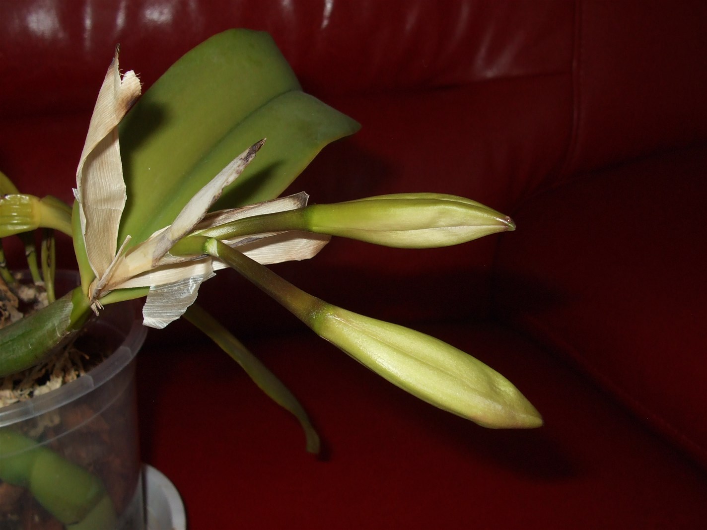 Rośnie w mieszance kory, chipsów kokosowych i perlitu. Doniczka plastikowa – wolę widzieć korzenie. Jak na razie, poza długim oczekiwaniem na pierwsze kwiaty sprawuje się bezproblemowo. Podlewam średnio raz na tydzień, ale zawsze po przeschnięciu podłoża, a więc częstotliwość podlewania zależy od pogody. Podlewam deszczówką, jeśli obserwuję wzrost rośliny to do każdego podlewania dodaje niewielką ilość wody z nawozem. Nawóz azotowy stosuję, kiedy rosną korzenie i zaczyna rosnąć psb, kiedy wykształca się pochewka zmieniam nawóz na zawierający więcej potasu i fosforu.