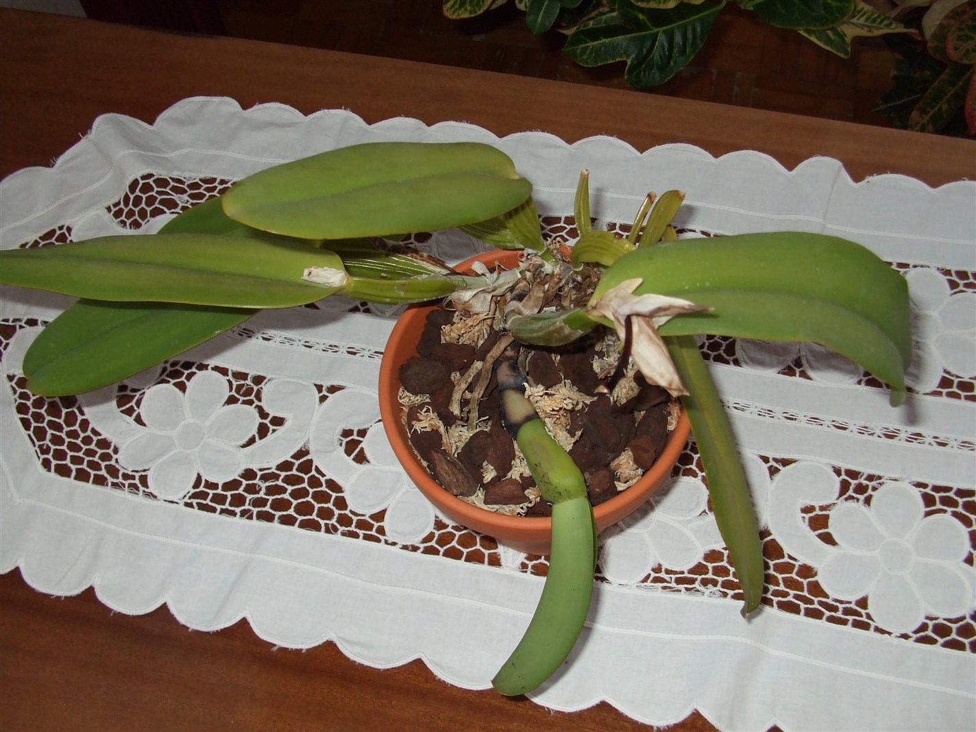 Rośnie w mieszance kory, chipsów kokosowych i perlitu. Doniczka plastikowa – wolę widzieć korzenie. Jak na razie, poza długim oczekiwaniem na pierwsze kwiaty sprawuje się bezproblemowo. Podlewam średnio raz na tydzień, ale zawsze po przeschnięciu podłoża, a więc częstotliwość podlewania zależy od pogody. Podlewam deszczówką, jeśli obserwuję wzrost rośliny to do każdego podlewania dodaje niewielką ilość wody z nawozem. Nawóz azotowy stosuję, kiedy rosną korzenie i zaczyna rosnąć psb, kiedy wykształca się pochewka zmieniam nawóz na zawierający więcej potasu i fosforu.