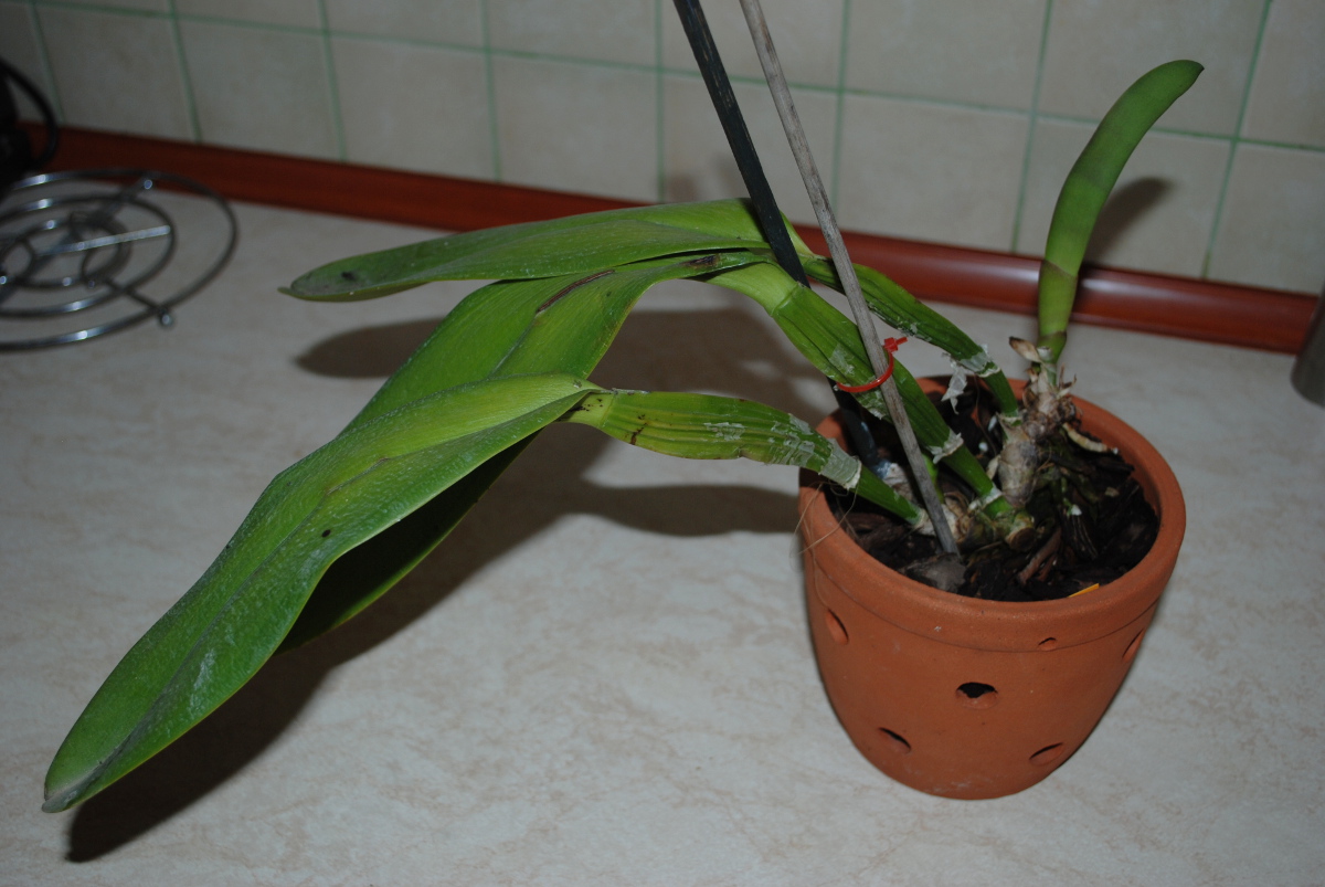 3. Wiosna - wiosnę przywitała roślina z trzema pomarszczonymi bulwami. Myślałem że pomoże jej słońce, wiatr. Roślina trafiła w raz z innymi cattleyami pod drzewo. Efekt, bulwy zmarszczyły się jeszcze bardziej, liście zrobiły się papierowe. Jednym słowem odwodnienie. Przeniosłem roślinę do foliaka, w cień, taki sam jak niektóre dendrobia. Dbając o ruch powietrza, roślina była spryskiwana po liściach dwa razy dziennie, raz dziennie spryskiwane podłoże. Nawożenie tylko dolistne. Liście nareszcie zaczęły wracać do formy, chociaż do ideału było daleko. Tylko w bardzo upalnie dni pozwalałem sobie na delikatne przelewanie całej doniczki.