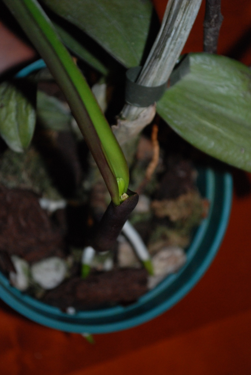 O tym że chce żyć potwierdziła wypuszczając nowy przyrost i korzeń. Ja skutecznie jej przeszkadzałem, a to ubijając nowy korzeń nożyczkami, a to zrzucając ją z półki. Do domu roślinka wróciła tuż przed wrześniowymi chłodami. Wczoraj postanowiłem zaglądnąć co ona tam ma w świeżo rozłożonym liściu. Roślina w planach miała trzy pączki, jeden jednak zamarł. Co dziwne, pączki pokazały się bez pochewki.