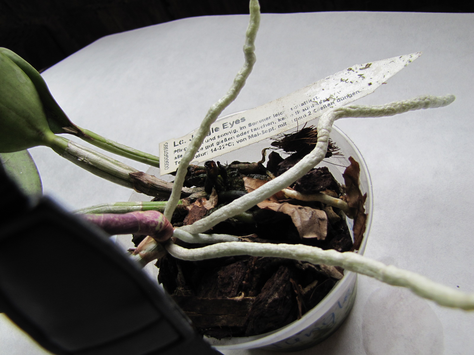 Chciałem zaprezentować mini hybrydę Lc Jungle Eyes. Zakupiona w roku ubiegłym, ze względu na ciekawe kwiaty i niewielkie rozmiary . Ponieważ w roku ubiegłym raczej nie miałem nadziei na kwitnienie i też nie byłem zbytnio opiekuńczy. Przetrwała okres jesienno-zimowy w zdrowiu (co dla mnie już jest sukcesem), a w tym roku trochę zacząłem traktować je poważniej, tzn. zastosowałem odważne nawożenie, zwiększone dawki Petersa i Biohumusu, a doniczkę o fi 10 cm wstawiłem do plastikowego kuba do piwa. Zapobiegło to szybkiemu przesychaniu podłoża (gruba granulacja) i ustabilizowało wegetację stroczyka, co zaskutkowało (jak sądzę) wytworzeniem pierwszej pbs i następnej, która ma pąk kwiatowy Ta hybryda mieści się w pierwszej kategorii, ponieważ równolegle tworzy nowe korzenie i pąk kwiatowy. Stoi na wschodnim parapecie. Jak sądzę, moje wcześniejsze problemy z kwitnieniem (u innych) były spowodowane zbyt szybkim i "za głębokim" przesychaniem podłoża. Jej kwitnienie prezentuję - tam