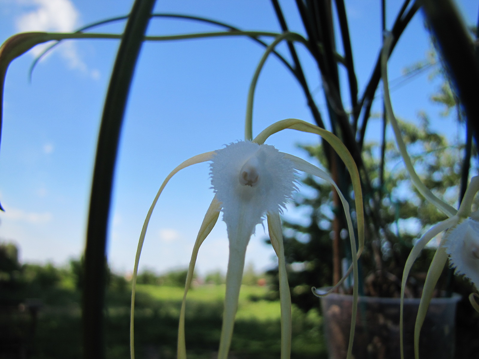 Zakupiona w tym roku, piękny okaz, pbs 40 - 50 cm długości, ale jak to często bywa w podłożu były korzenie w stanie tragicznym. Stała pod ledami 2 miesiące, przesadzona i obsadzona na kawałku korka, jest w doniczce obsypana podłożem. Pojawiło się kilka nowych korzeni i w końcu wystartowała ok. 2 miesięcy nowa pbs. Ku mojemu kompletnemu zaskoczeniu ok. 1 miesiąca temu na 3 pbs pojawiły się łodyżki kwiatowe. Kwiaty są dość duże, na razie nie pachną, może trzeba jeszcze poczekać na aromaty Stoi w półcieniu, temperatura 25/20 C.