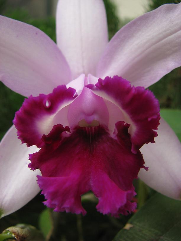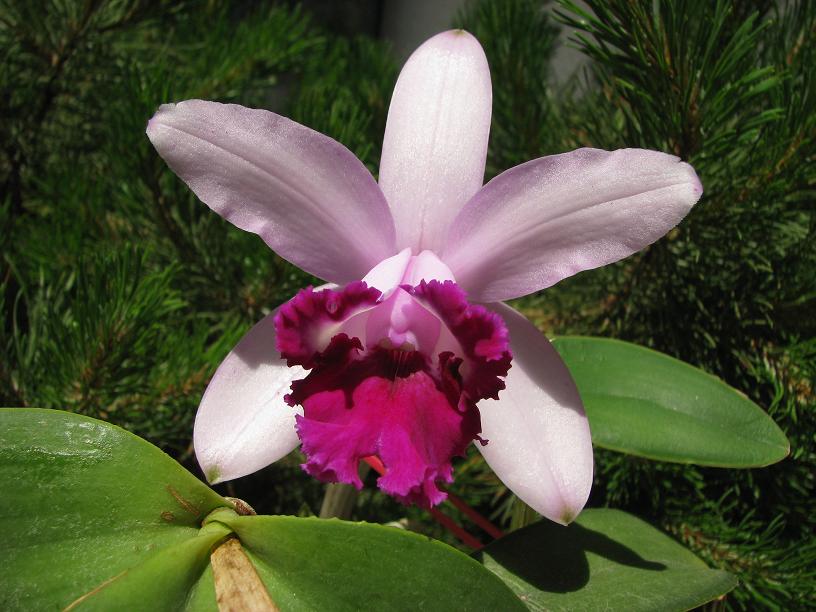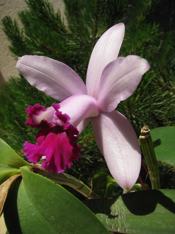 Po trzech latach uprawy zakwitła u mnie cattleya intermedia var. orlata 'Rio'. Myślę, że warto było czekać Kwiat ma rozpiętość ok. 10 cm, niestety nie pachnie. Zaraz po otwarciu płatki miała biało-zielonkawe, w ciągu doby przybrały lekko fioletowy odcień. Uprawiana na parapecie cieniowanego przez balkon okna południowego, latem na zewnątrz. Zimą podlewana raz w miesiącu bez nawozu, między podlewaniami spryskiwałam podłoże raz na kilka dni, może raz na tydzień. Szczerze mówiąc ubiegłej zimy zapomniałam o moich cattleyach trochę bardziej niż zwykle Ostatniej zimy trochę doświetlana, może dlatego zakwitła? Wcześniej wypuszczała pochewki, niestety bez kwiatów. Tym razem się udało. Roślina jest już dość porządnie rozrośnięta, zatem może następnym razem będzie lepiej