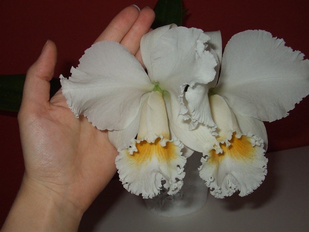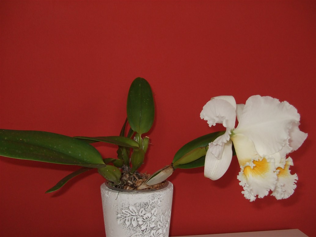 Uprawiam tą cattleyę ok 4 lata. Mam ją od sadzonki, zakupiona była jako oznaczona hybryda, ale zniszczyła mi się fiszka więc jest nn. Jest to i tak bez znaczenia, bo miała być to semi alba - biała z czerwoną warżką, a ku mojemu lekkiemu rozczarowaniu okazało się, że jest biała. Jednakże, za bardzo się nie zmartwiłam, bo kwiaty są bardzo efektowne.