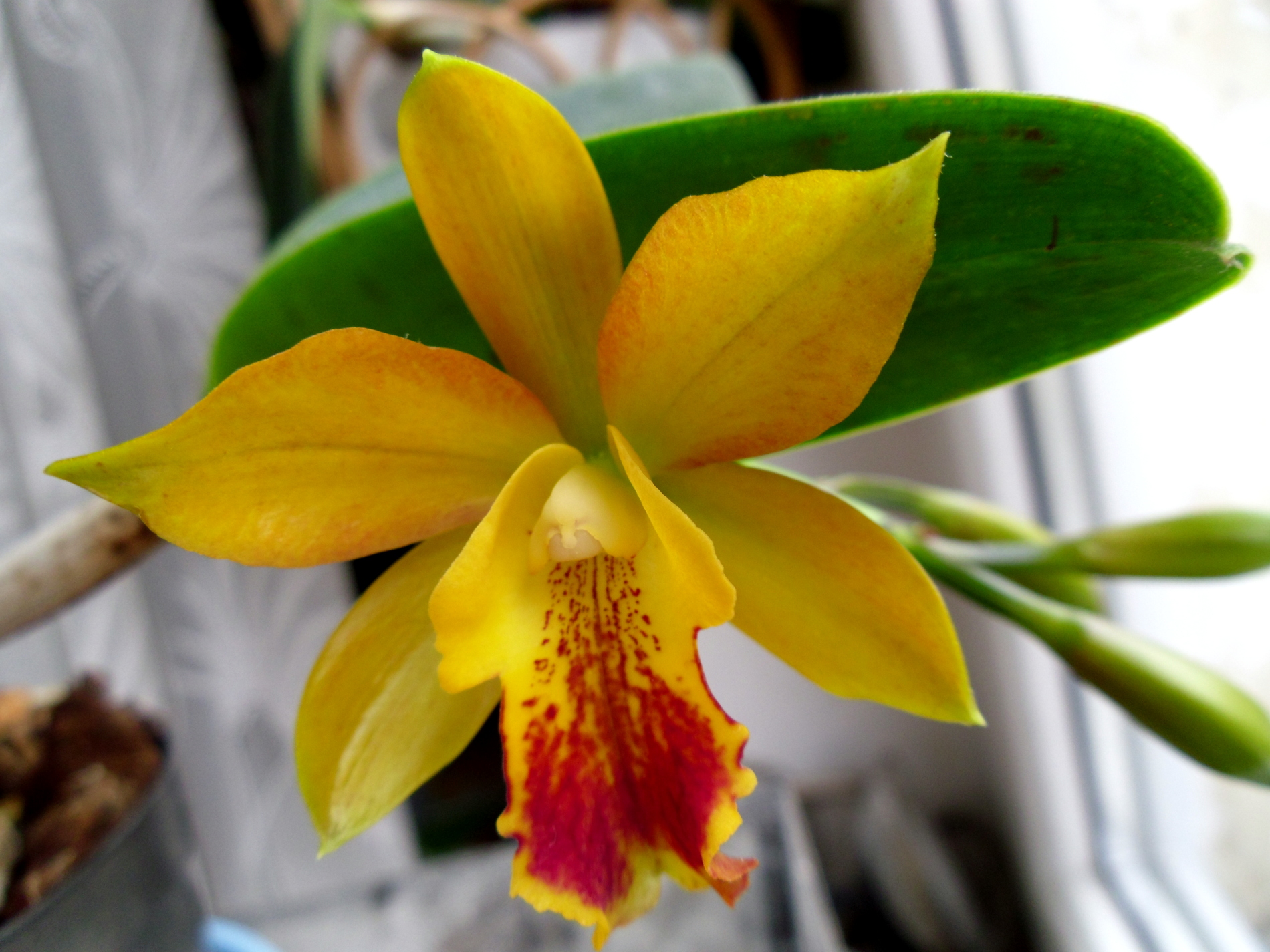 Długą historię ma ta katleja. Gdy w sierpniu 2010roku przechodziłam obok stoiska z kwiatami uderzył mnie piękny zapach, wróciłam się i z obecnych tam tylko ta katleja mogła pachnieć. Cena była b wygórowana, pomyślałam sobie poczekam aż zamęczą, obniżą cenę i kupię. W końcu kupiłam ją po dwóch tygodniach za 15zł ale tak zamęczyli że chyba wrzątkiem ją podlewali. Nie miała ani jednego korzenia. Zajęłam się bidulą w domu, dostała nazwę ,,Męczennica,, i zaczęła rosnąć. Po dwóch latach dałam ją koleżance bo już nie miałam do niej cierpliwości. Katleja dalej była słaba wię wróciła do mnie. W X.2014 dopadły ją wciornastki. Trzeba było zastosować chemię, ciężko to odchorowała. Była jakaś taka,, bladziutka,, na imię ma Męczennica, więc traktowałam ją jak sałatę.