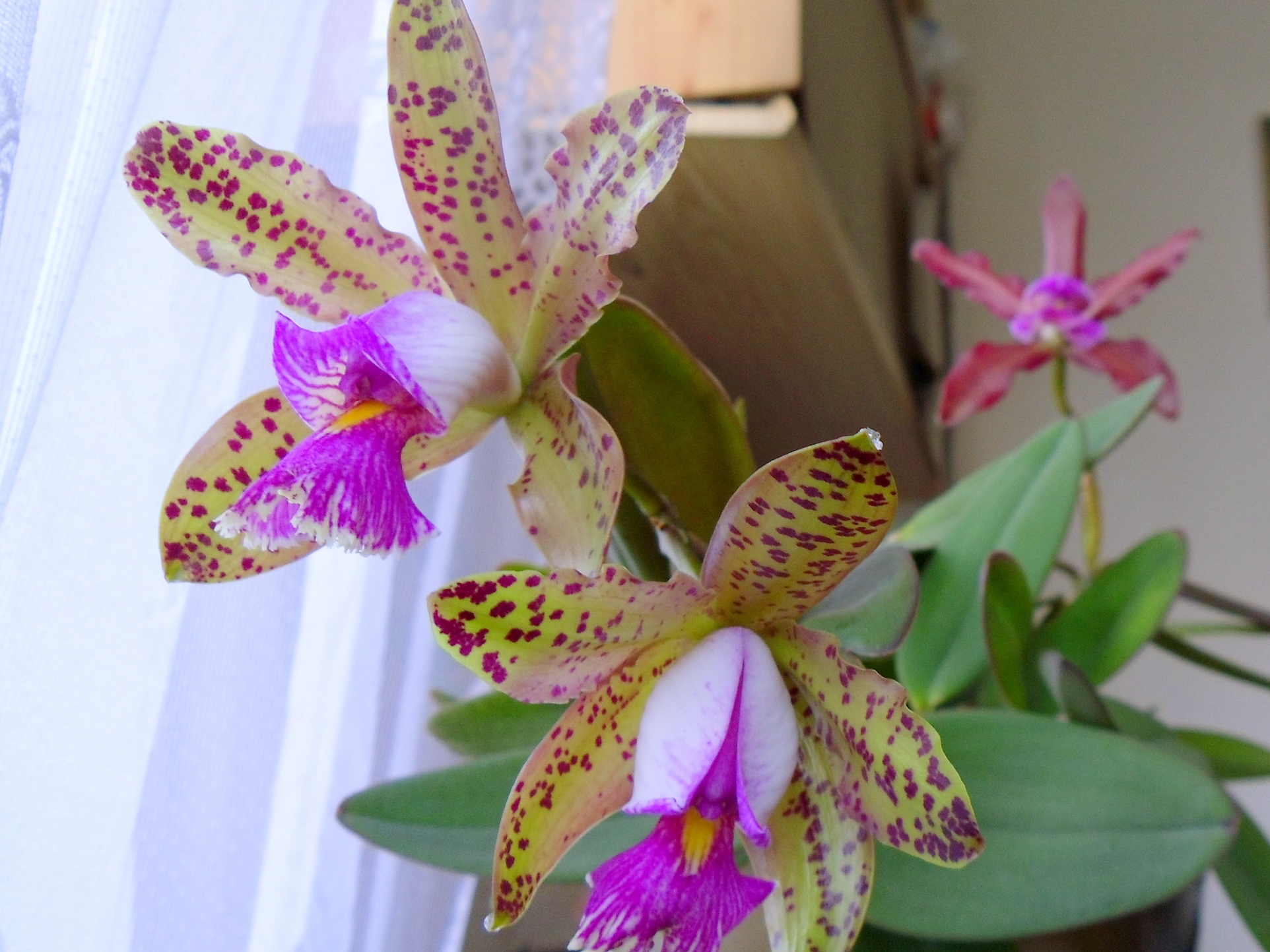 Minęło kilka lat bez kwitnień spowodowanych inwazją wciornastków. Potem musiały odcierpieć zastosowanie chemii i wreszcie wróciliśmy do stanu wyjściowego więc znowu tylko jeden kwiatek. Jest jednak niespodzianka. Płatki stały się wyrażniej nakrapiane. Proszę porównać zdjęcia. Zapach z wyrażnego paczuli trąci trochę mydłem ale dalej jest silny i piękny. Wygląda na to że geny Cattleya guttata zaczęły przeważać. Czy ktoś zetknął się z tym że krzyzówki w miarę upływu czasu zmieniają się? Marta