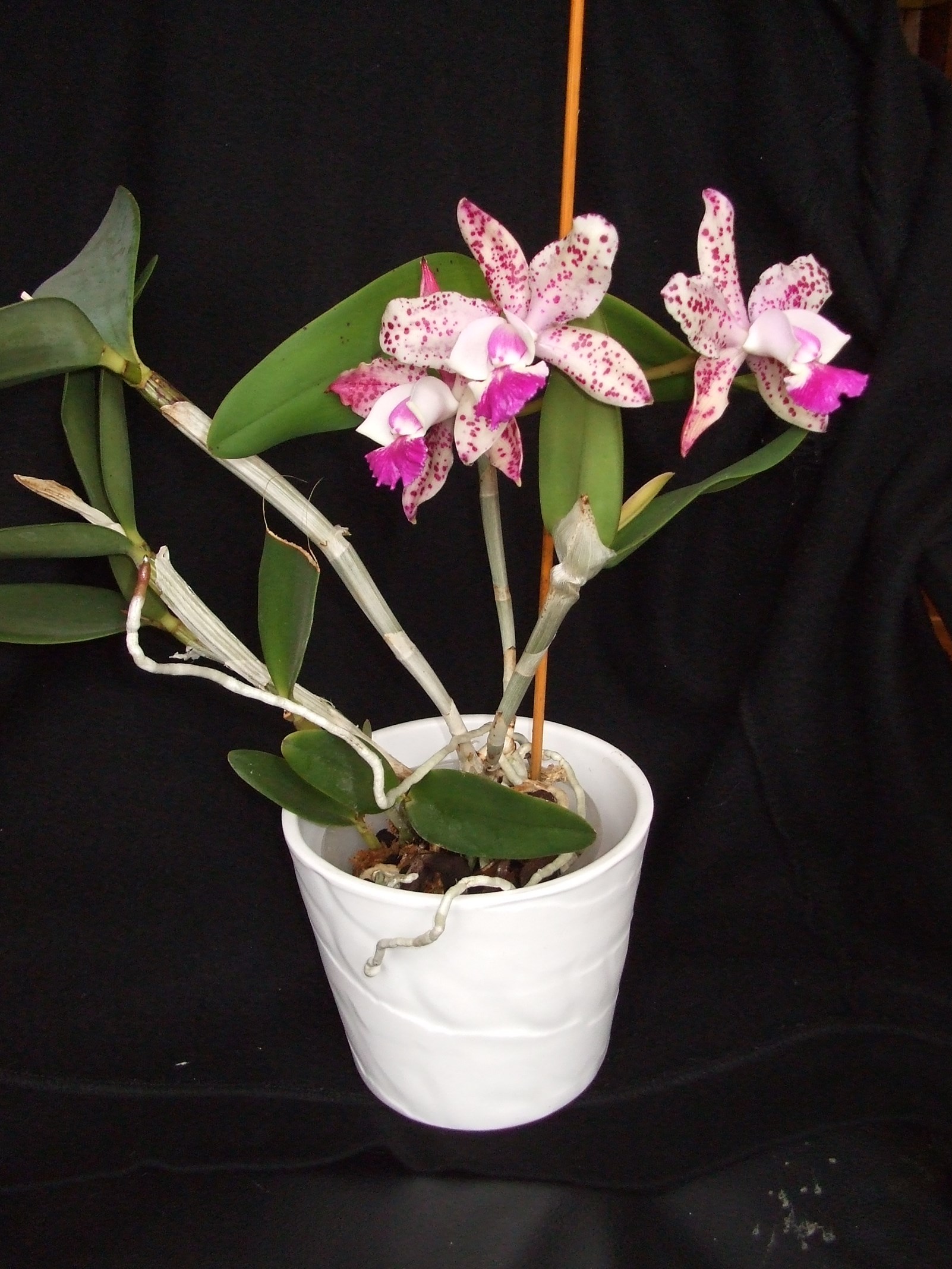 Około tygodnia temu rozkwitła mi po raz pierwszy ta hybryda cattleya. Zakupiłam ją na wiosnę razem z czterema innymi, które były w bardzo okazyjnej cenie i jak się tego domyślałam bez korzeni. Dlatego z przyczyn ostrożności trafiła do kwarantanny i stała tam aż do momentu zakwitnięcia. Uprawiana na południowym parapecie i oszczędnie podlewana ( kwarantanna+plus pokój do którego rzadziej zaglądam). Rosła dość ładnie, pięknie się ukorzeniła, wydała jeden przyrost,który wypuścił mała pochewkę , ale nie zakwitł, no i drugi większy, który rozkwitł 3 kwiatami.