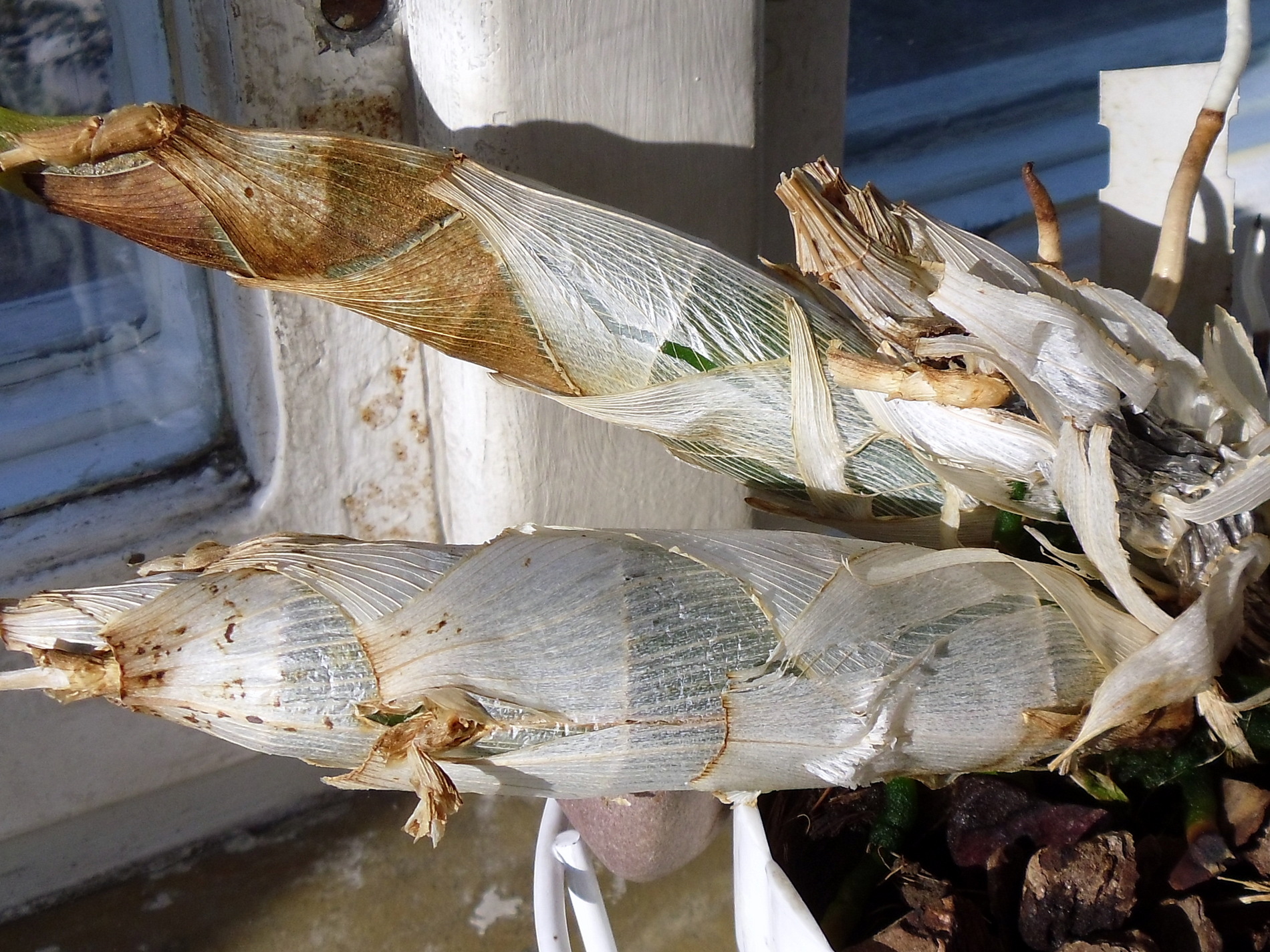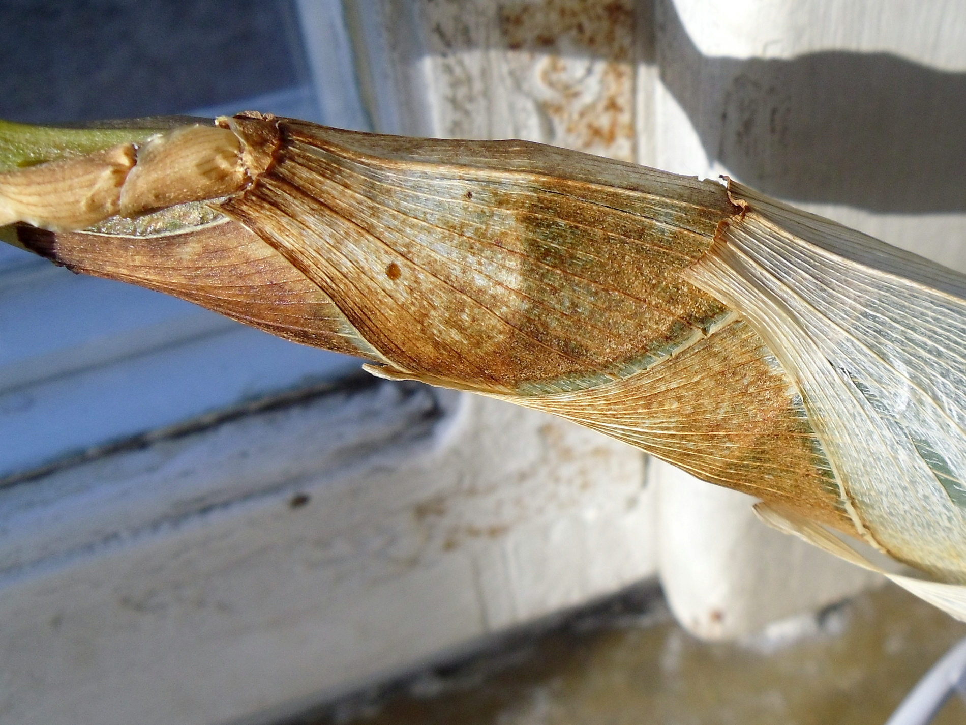 Pierwszy raz spotkałam się z brązowieniem, zazwyczaj białych, łusek na psb. Pseudobulwa jest twarda, nie wydziela gnijącego zapachu, a nawet przyrasta po kwitnieniu (vide prezentacje) i poniższe zdjęcie. Jedyne co się zmieniło, to fakt że stała w odległ 10cm poniżej lampy doświetlającej Aquatic/Nature 26watt Red-White 7100-6500 K* . Może to jest poparzenie ,,słoneczne,, lub termiczne. Liście oraz korzenie nie zmieniły się. Co to może być? Jak ognia boję się choroby grzybowej ale mam niskie wilgotności powietrza i nie zdarzają mi się. Tak to jest~, że albo przędziorki, albo choroby grzybowe.