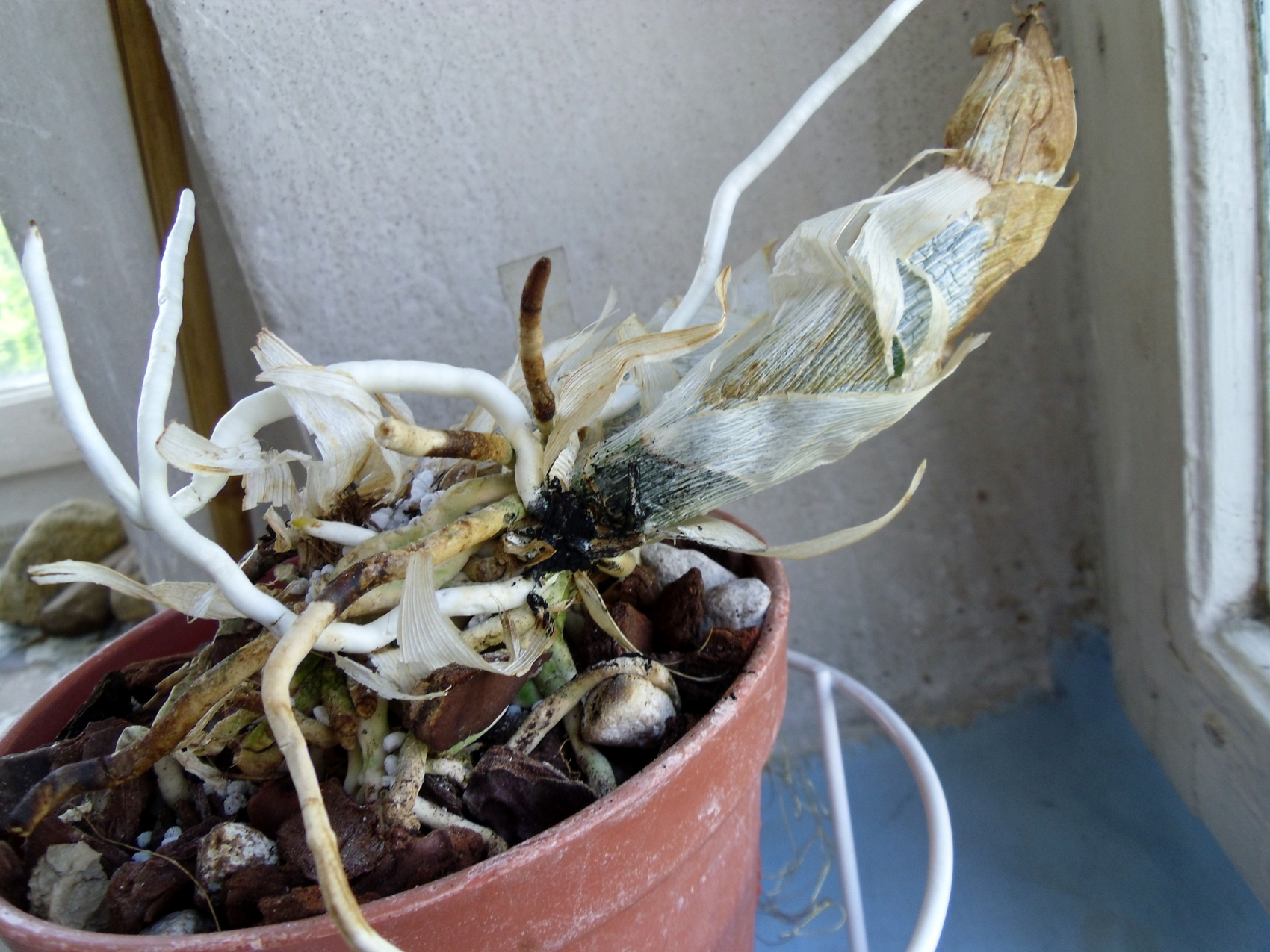 W tym roku nowa psb wyjątkowo nie chciała zapuszczać korzeni w podłoże. Pierwszy raz mi się takie zachowanie zdarzyło. Potem okazało się że w podłożu są glony. Nie mniej jednak sprawa wydaje się być bardziej złożona bo dotyczy to także i innych, niektórych śpiochów: Clowesetum Jumbo Apollo, Cycnoches loddigesii, choć w słabszym natężeniu. Podlewane są należycie, nawozy Petersa i ogólnie traktowane jak w latach porzednich. Zawsze nawożę lepiej zbyt mało, niż zbyt dużo. Podejrzewam że przyczyna tkwi w podłożu (stale ten sam producent) lub w owych nawozach. Może w podłożu jest zbyt dużo kawałków kory z żywicą. Może póżniej uda mi się rozwikłać tę orchidzagadkę. Obecnie musiałam ratować roślinę i chyba mi się udało. Nieocenionych rad udzielał mi p. Krzysztof Gozdek. Dziękuję. Popatrzcie. Marta