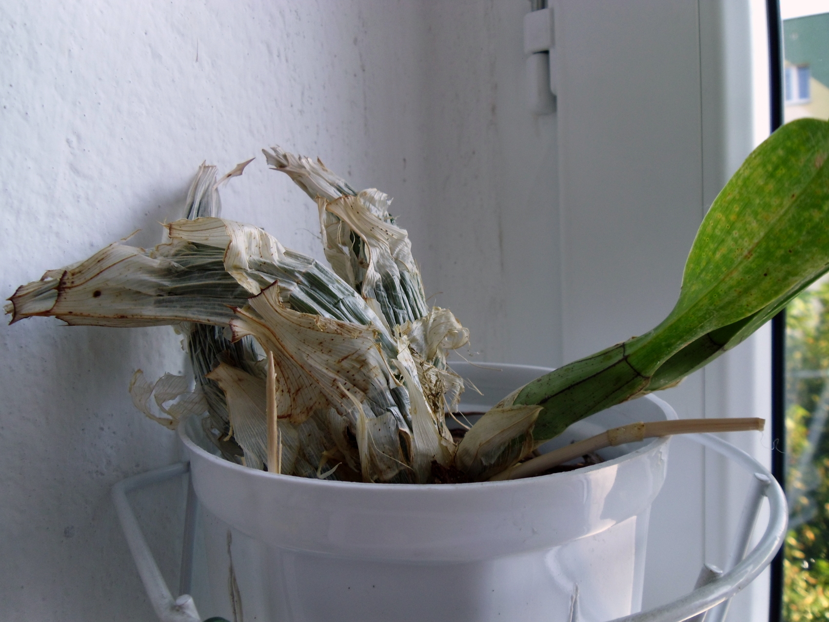 Pseudobulwy z poprzednich lat starają się utrzymać roślinę przy życiu i się pokurczyły. Roślina cofnęła się w rozwoju.