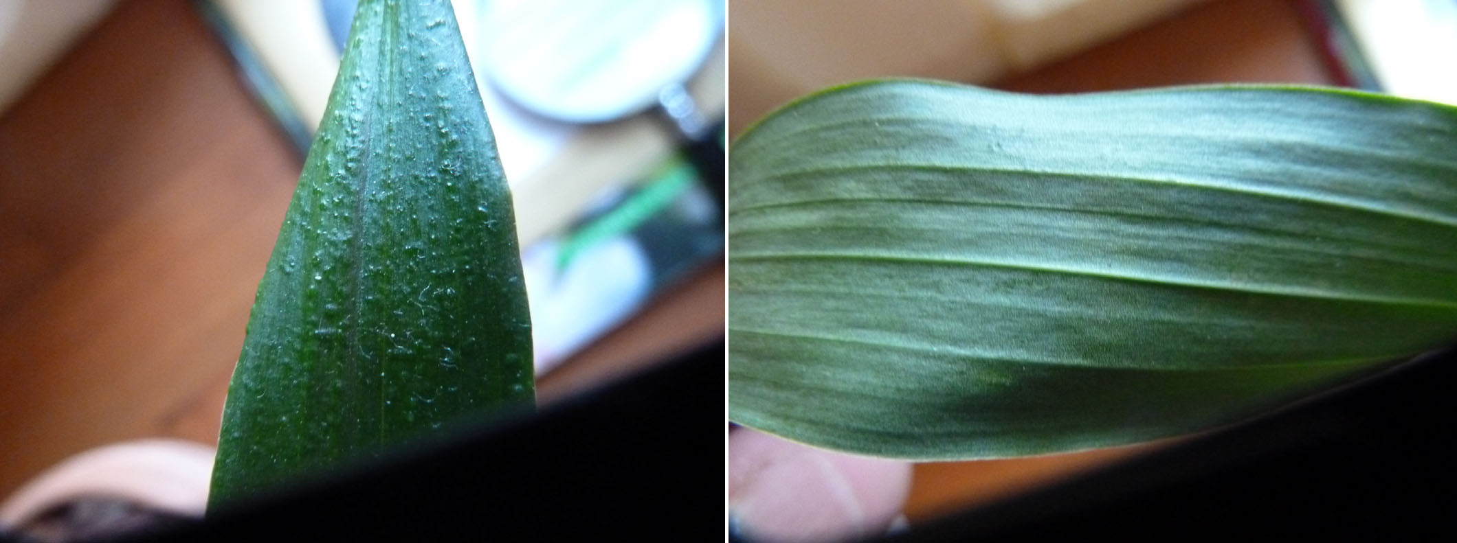 Fotka od lewej pokazuje zgrubienia wewnątrz liścia, te drobne jasne punkty, to drobiny kurzu. Prawe zdjęcie pokazuje spodnią stronę tego samego liścia. Nie widać tam żadnych zmian.