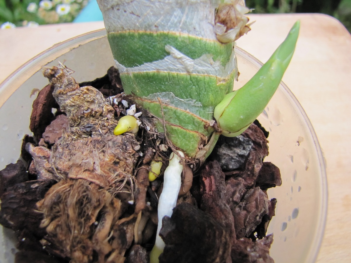 Na początku lipca 2019 otrzymałem paczkę z nowo zakupionymi śpiochami, w tym był Mormodes rolfeana, jedna (ale w rozmiarze XXL) pseudobulwa w stanie uśpienia. Po kilku dniach, ku mojemu zaskoczeniu, pojawił się początek nowej pbs. Równolegle zaczęły rosnąć nowe korzenie, ale ze starej pbs, co jest zupełnie nietypowe. Po następnych dwóch tygodniach nowa pbs weszła w etap normalnego wzrostu, czyli korzenie też zaczęły rosnąć