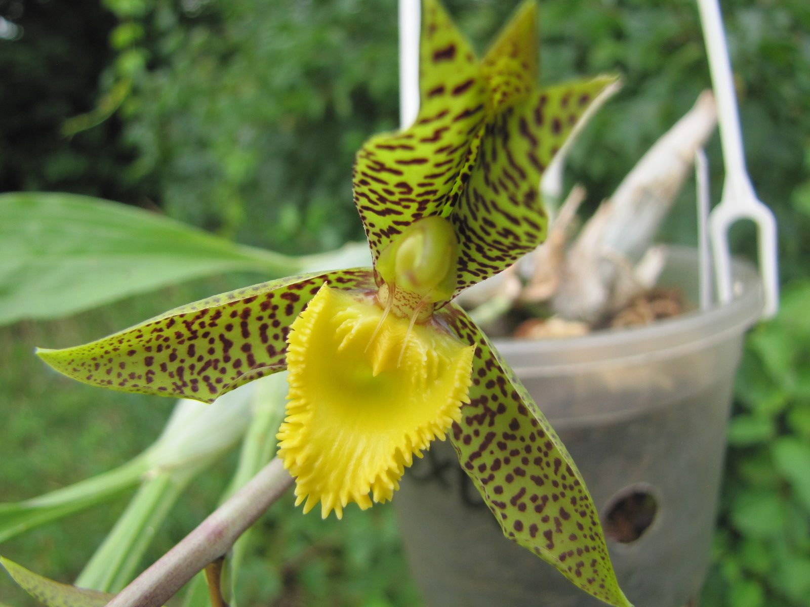 To dopiero początek kwitnienia, zrobiłem fotki rano jak było słońce i nie padał deszcz. Kwiaty pachną, ale słabo, musze poczekać jeszcze 2 - 3 dni jak wszystkie się rozwiną. Kupione w roku ubiegłym, teraz kwitnie drugi raz. Średniej wielkości catasetum.