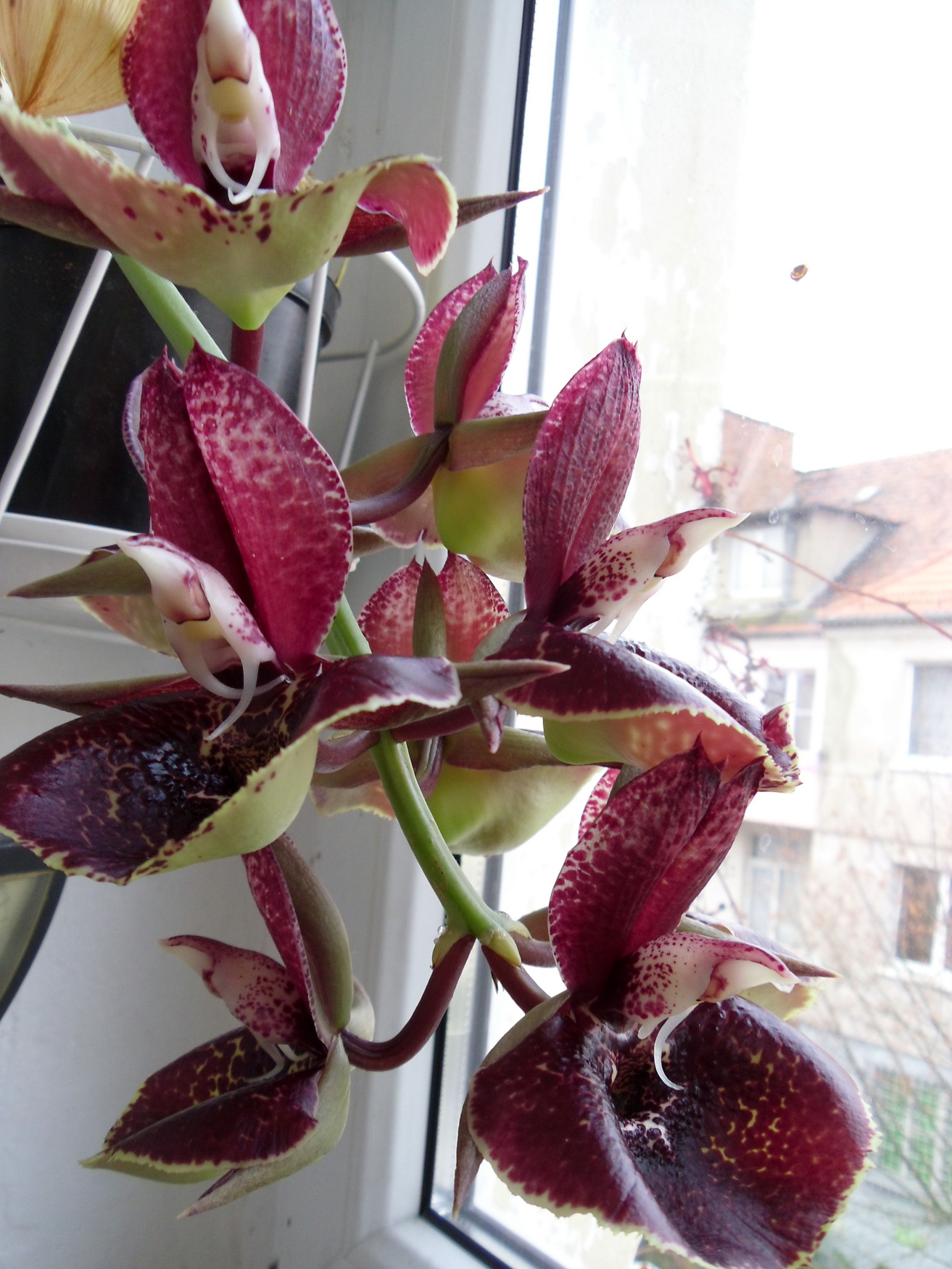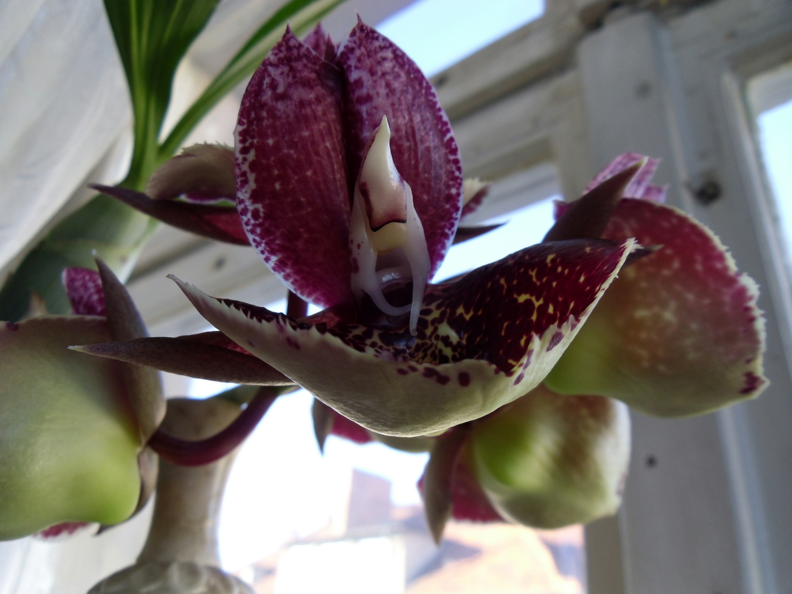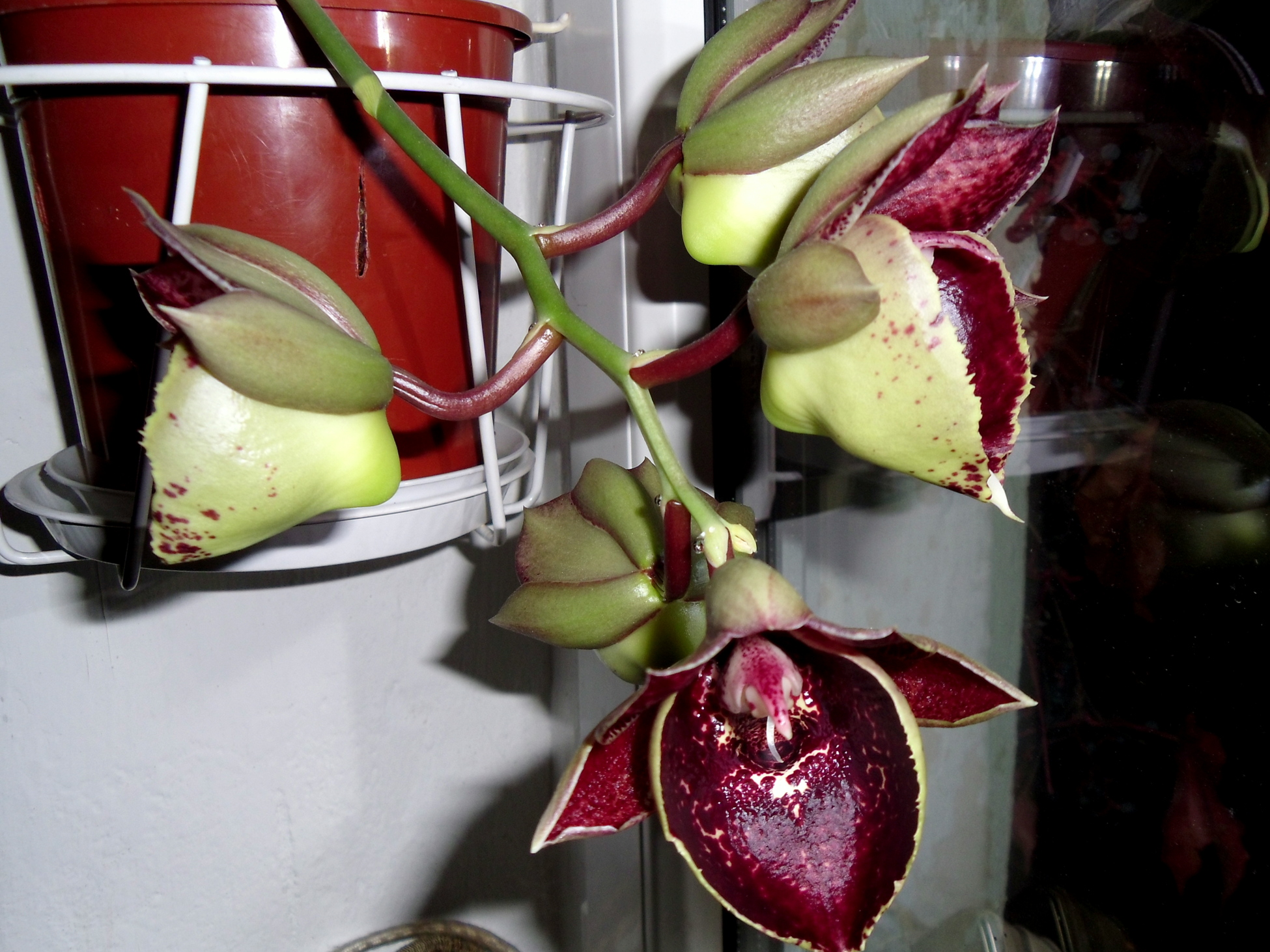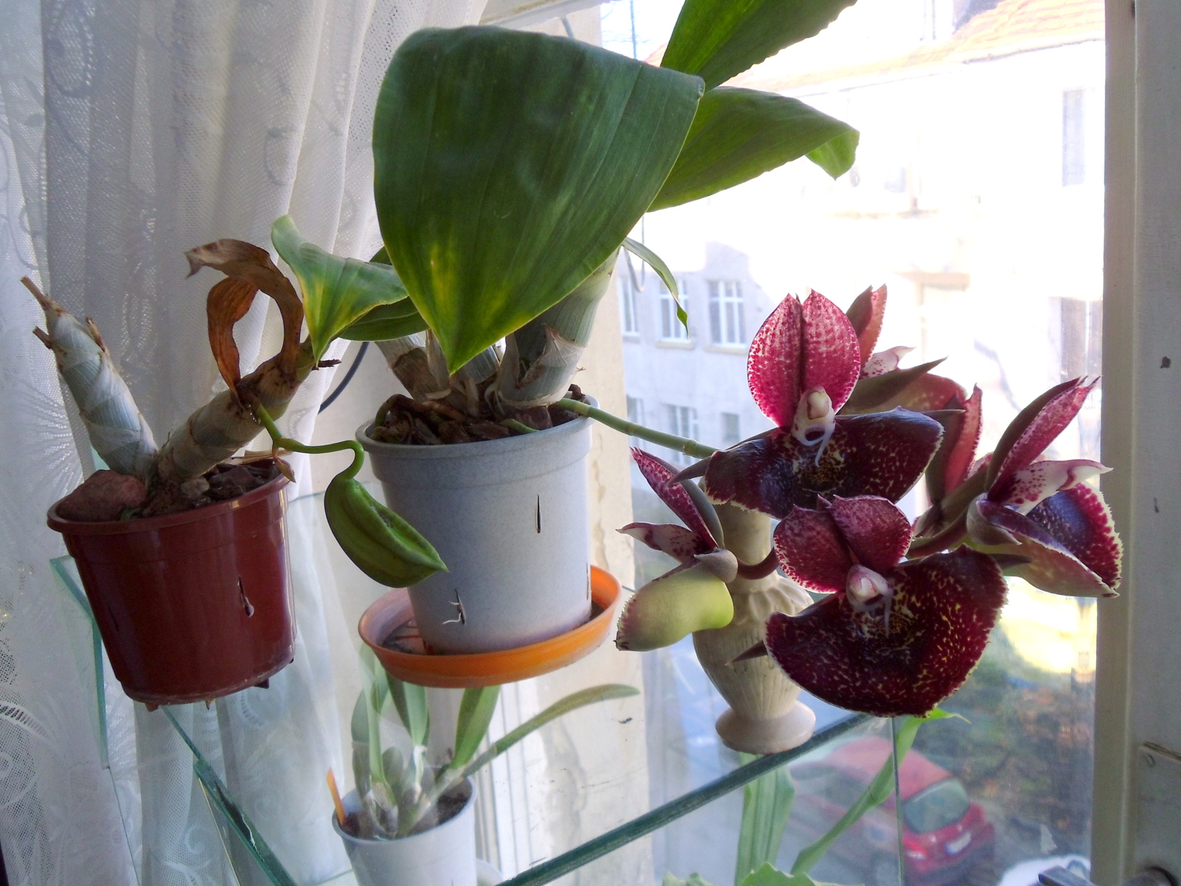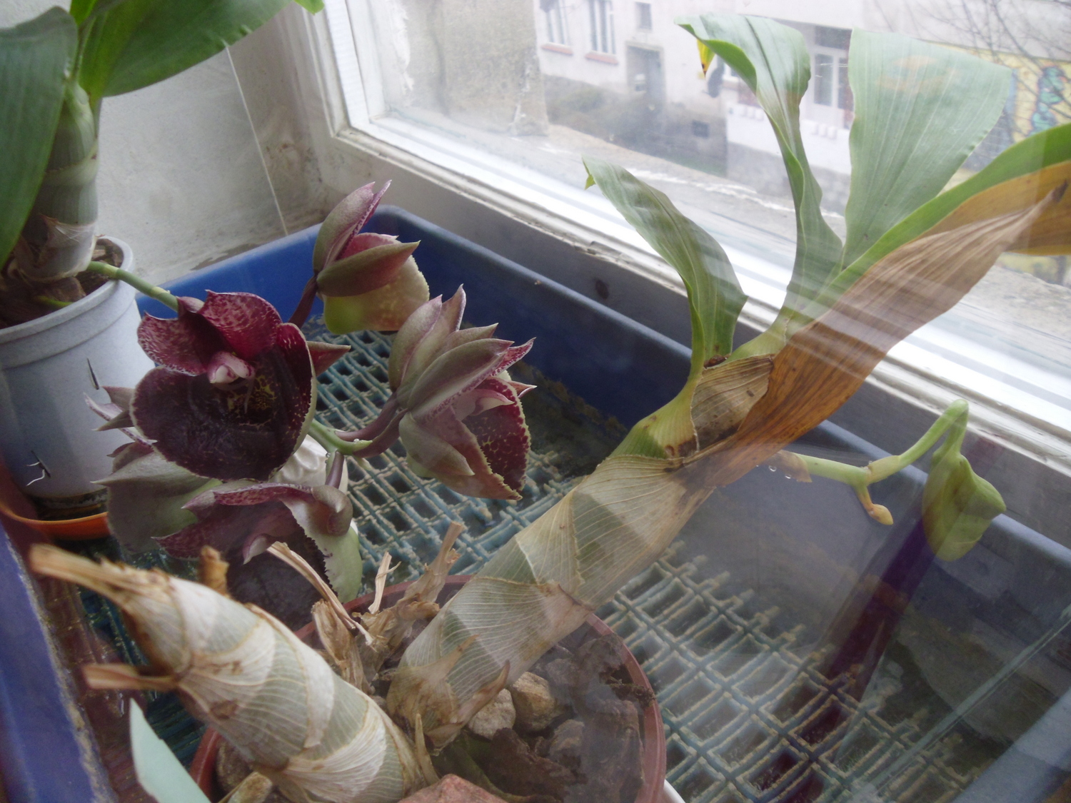 Pozwolę sobie podłączyć się do tego wątku ze swoim Catasetum pileatum. Kupiłam je za 15 euro w 2010r na wystawie w Berlinie. Roślina była dorodna i takież ślimaki miała. Przesadziłam ją bo w podłożu było dużo sphagnum. Wkrótce wytworzyła łodygę kwiatową ale pąki oberwałam aby oszczędzić jej siły. Następnego roku kwiaty zamarły z powodu nawiewu zimnego powietrza. Poza tym że wymaga wyższej temperatury uprawiam go tak, jak każdego innego ,,śpiocha,,. Lodyga kwiatowa rozwija się bardzo długo. U mnie trwało to od 11.IX. do 29.XI. ale warto było czekać bo widok jest przedni. Podziwiajcie bo kwiat wydaje mi się niesamowity. Marta