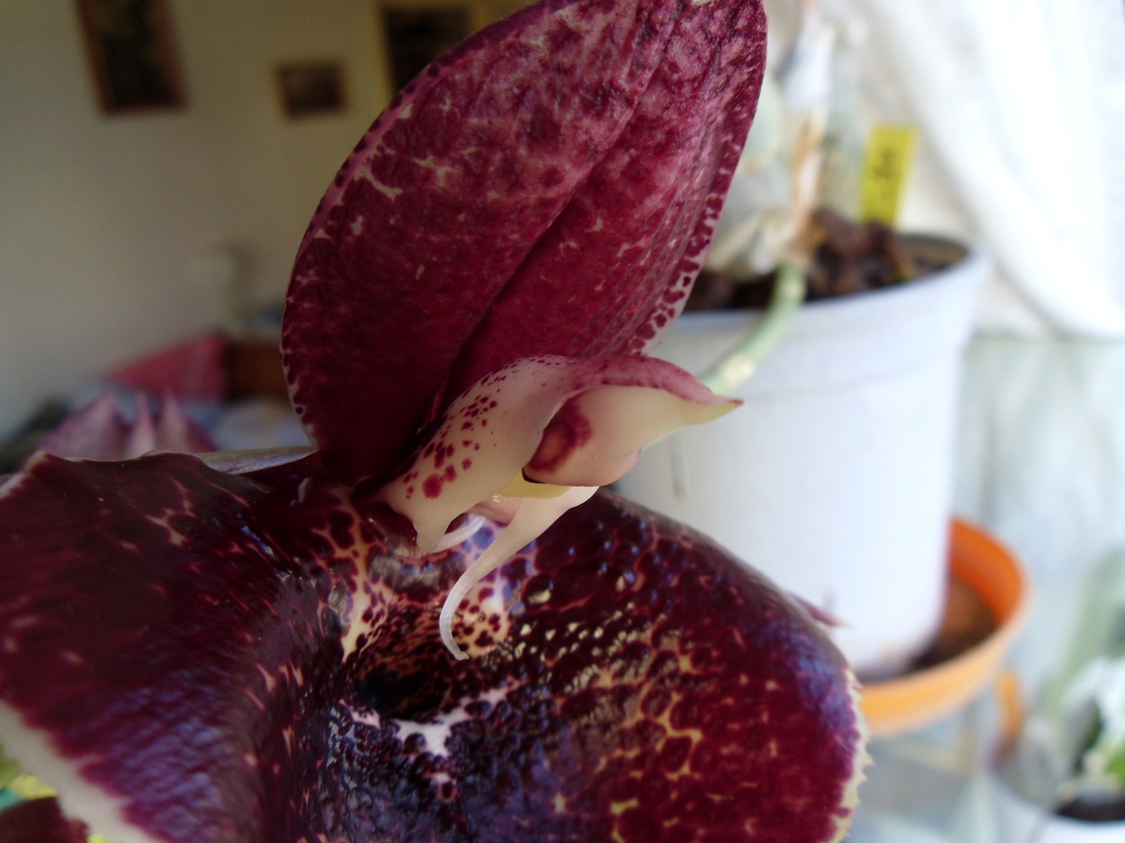 Info dla tych którzy zamierzają mieć w przyszłości to cudo - kwiaty trzeba bardzo ostrożnie traktować, tzn. nie polecam storczyka np. przestawiać lub tym bardziej wąchać. Powód jest taki, że pyłkowina bardzo szybko reaguje na (chyba) drgania powietrza wokół kwiatu i wylatuje z kwiatu jak pocisk, przylepiajac się do (zwykle) nosa i się przykleja. W naturze w ten sposób storczyk atakuje owady, które na grzbiecie przenoszą pakiet pyłku. Niestety, taka oderwana pyłkowina powoduje znaczne skrócenie żywotności kwiatu.