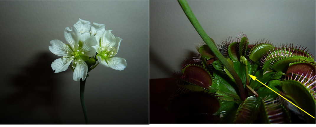 Ale, żeby nie było zastrzeżeń co do braku akcentu storczykowego pokażę szczęście w nieszczęściu jakie przydarzyło się z Psycopsisem korzystającym z światełek ledowych. Moja Pani złapała jakiegoś owada w zakupionych owocach cytrusowych i postanowiła nakarmić rosiczkę. Robiła to tak ochoczo, że złamała wyrastający pęd kwiatowy mego 'psychola'. Myślałem, że wyjdę z siebie, ale widząc jej przerażenie odpuściłem. Dramat łagodził wzrost drugiego pędu (prawa fotka)
