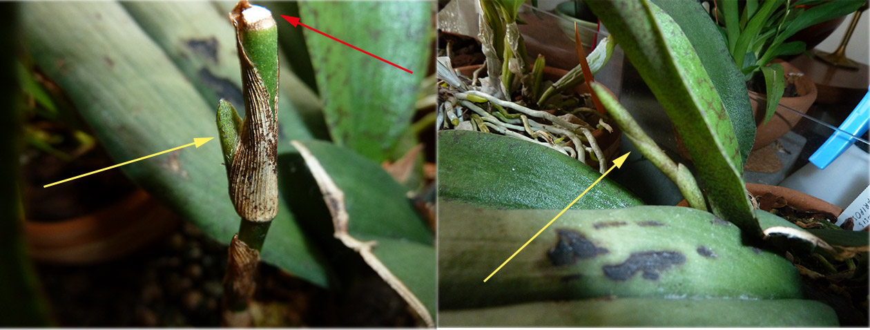 Tydzień temu spostrzegłem coś z czym nie spotkałem się dotychczas na forach storczykowych. Ten złamany kikut (strzałka czerwona), który w pierwszym momencie chciałem wyciąć, po niespełna dwóch miesiącach zaowocował nowym pędem (strzałka żółta). Karmienie owadożercy odbywa się teraz z podwójną ostrożnością.