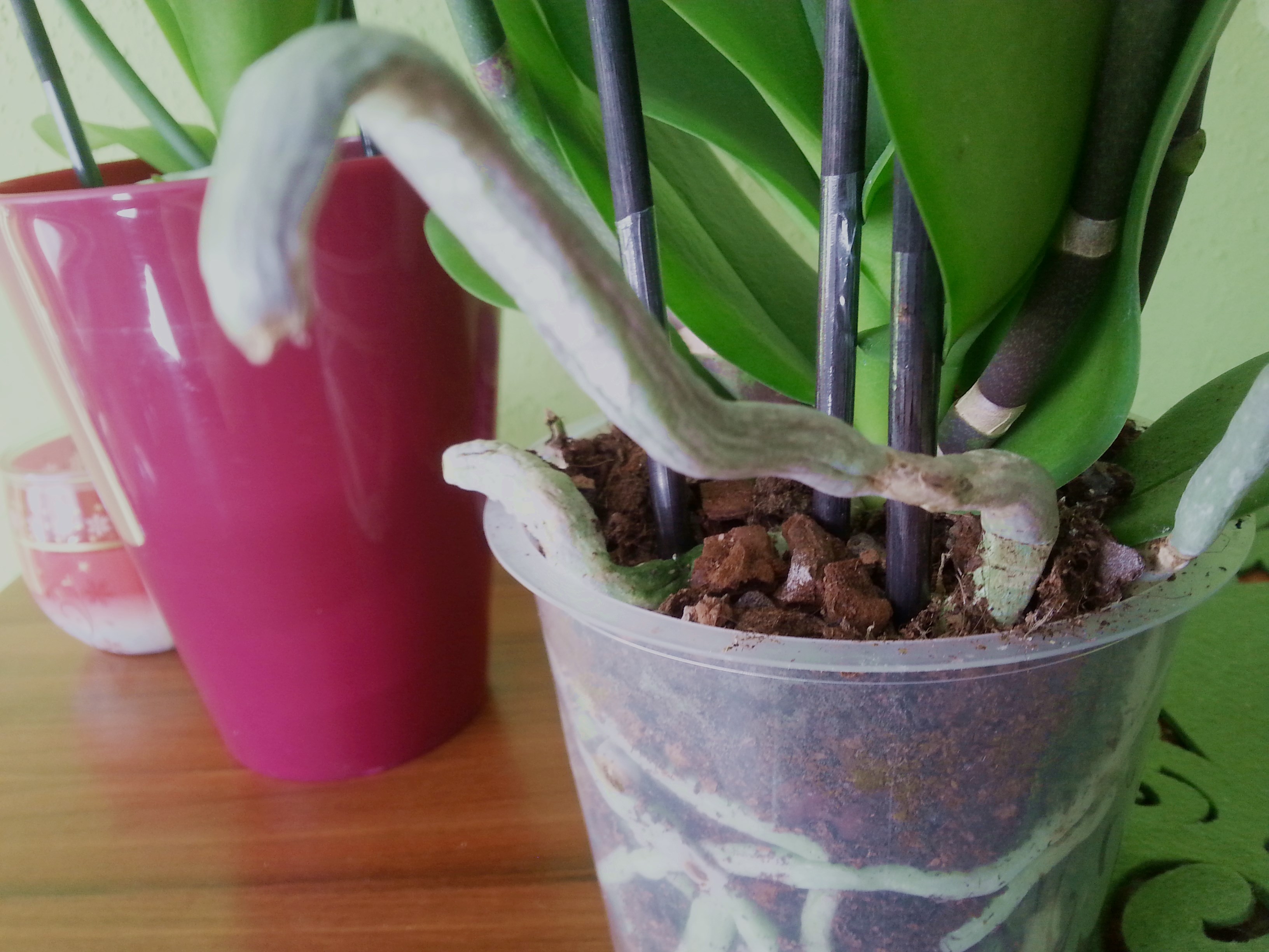 2. Mam go od tygodnia (dziś mam zamiar go podlać pierwszy raz) - część korzeni ma całkowicie wysuszone. Jednak gdy próbowałam je podciąć w środku są czarne i sypkie, jak węgiel. Podejrzewam, że to wina zbyt mocnego nawożenia w sklepie. Jak z nim postępować? Te korzenie które nie są wysuszone nabierają dziwne kolory, część ma bardzo ciemny intensywnie zielony kolor (nienaturalny jak na storczyka) a inna cześć z kolei bieleje, pokryta jest białymi jakby kropkami. Wszystko zaprezentuję na zdjęciach.