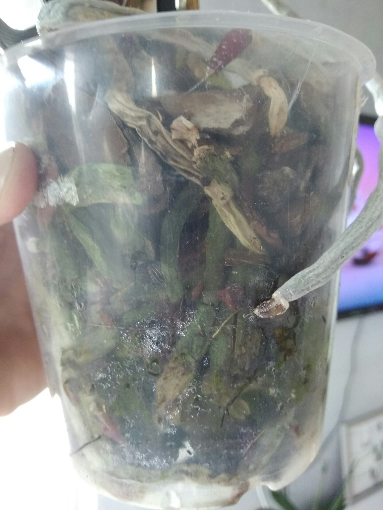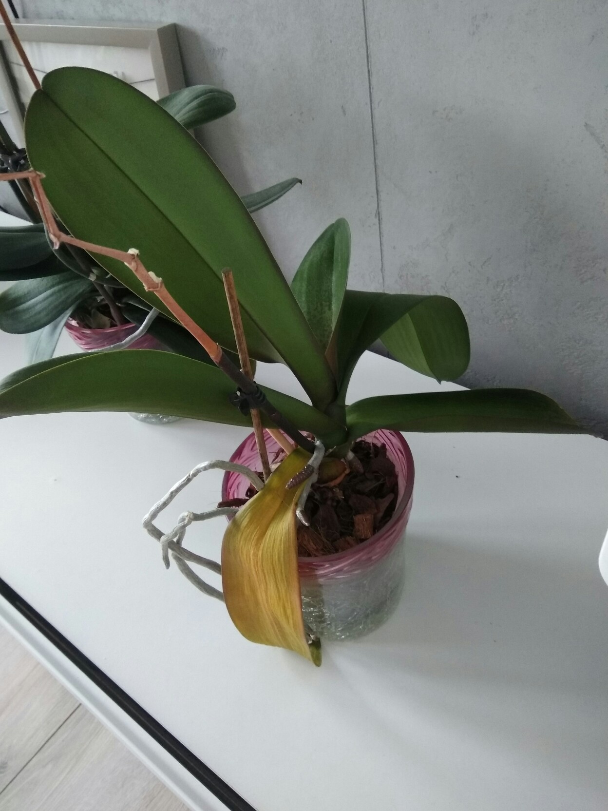 Jeśli doniczka w której rośnie orchidea ściśle przylega do osłonki efekt marnienia kwiatka murowany. Osłonka musi być dużo szersza by podłoże mogło swobodnie przesychać w całej objętości. Na podłożu Twojego storczyka ewidentnie widać, że góra jest sucha, a dół mokry. Nie może tak być.
