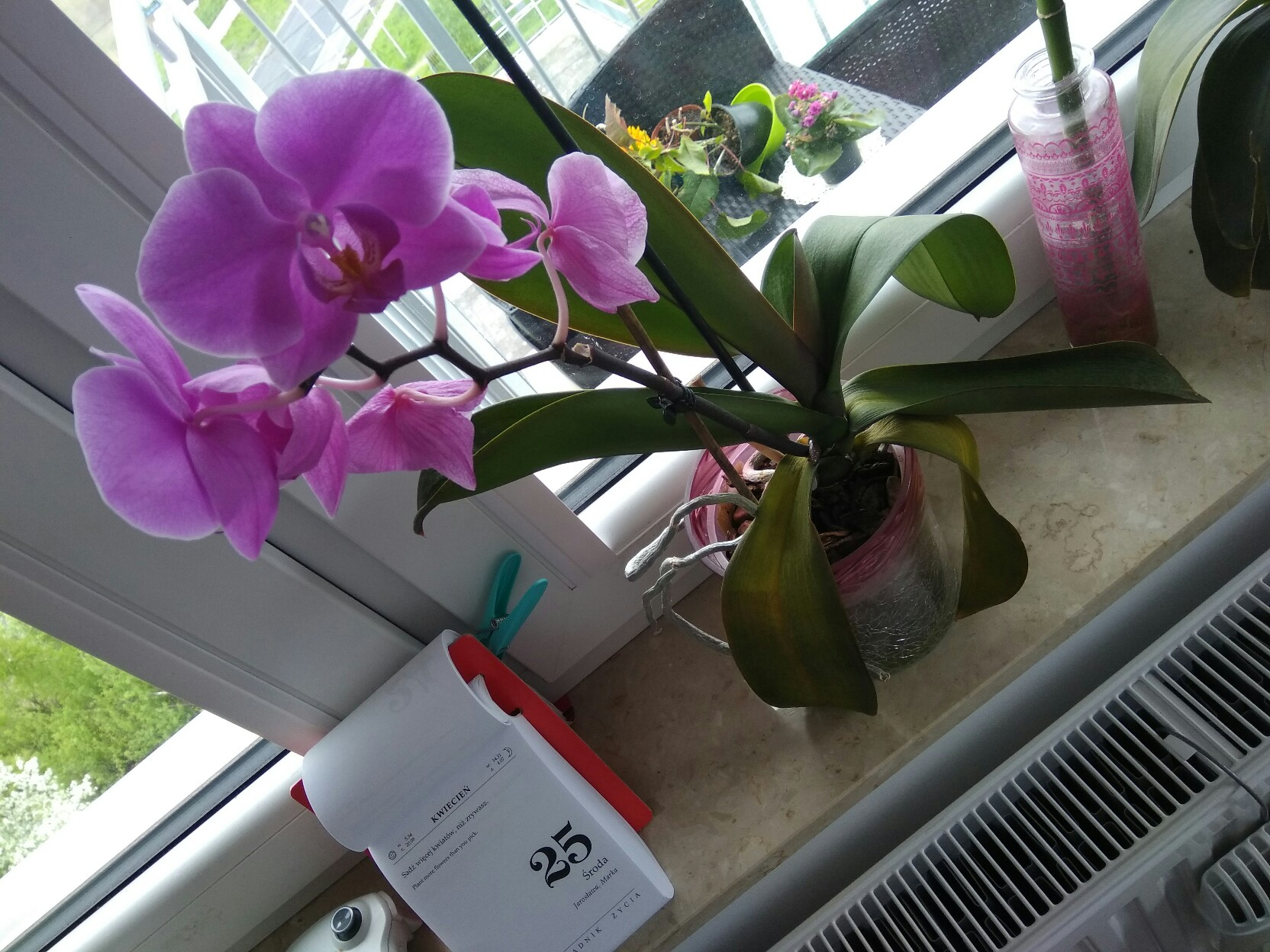 Tak, stoi na południowym oknie. Temperatura pokojowa ok 21stC. Podlewam go gdy podloze przesycha i korzenie stają się jasne przez moczenie w wodzie z nawozem ok 30 min.