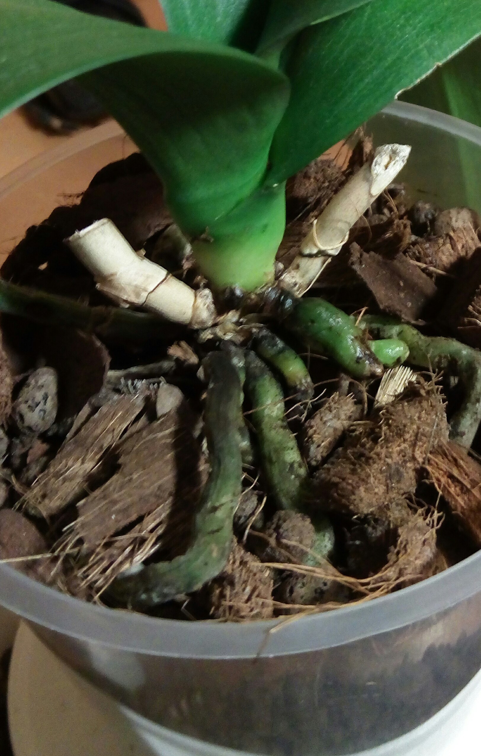 Wygląda na nowe korzonki... każdy liść u Phalaenopsis ma własny korzeń/korzenie. Czyli jak nowy liść wyrasta to i korzeń/enie z nim. I jak najstarsze liście zżółkną i odpadną to i korzenie które "należały" do tego liścia poumierają.