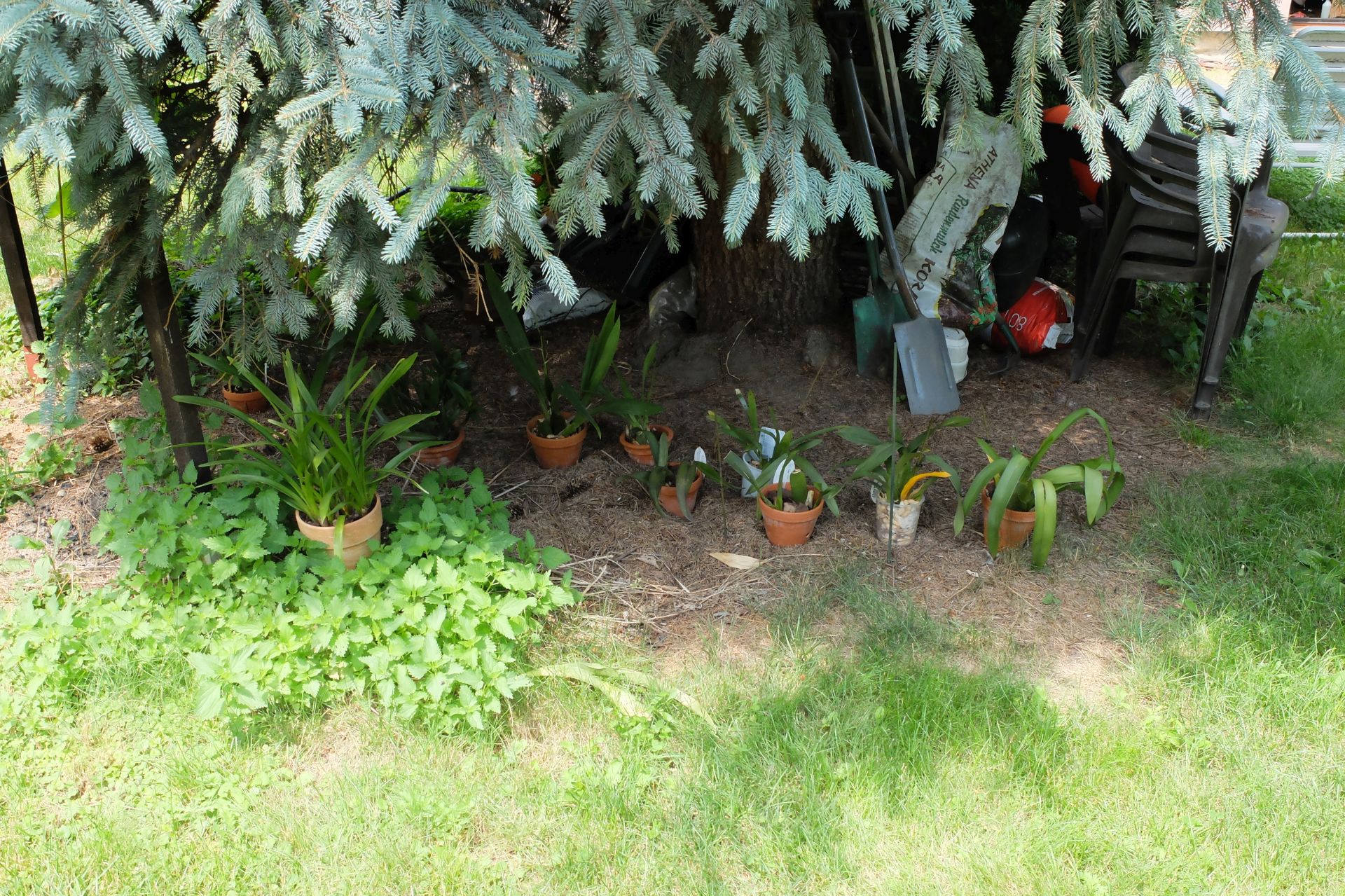 Nie mam lepszej niż ten świerk miejscówki dla storczyków. Poza tym ślimak wszędzie wejdzie. Jakiś czas temu zauważyłem, że ślimaki lubią się melinować w doniczkach. Nie przyszło mi jednak do głowy, że mogą również żerować na korzeniach. Łatwo się ich pozbyć zanurzając doniczki w wodzie. Wyłażą wtedy do góry i można je wyłapać. Dodatkowo rozsypałem wokół granulat Brossa - z działkowego doświadczenia wiem, że do najbardziej skuteczne.