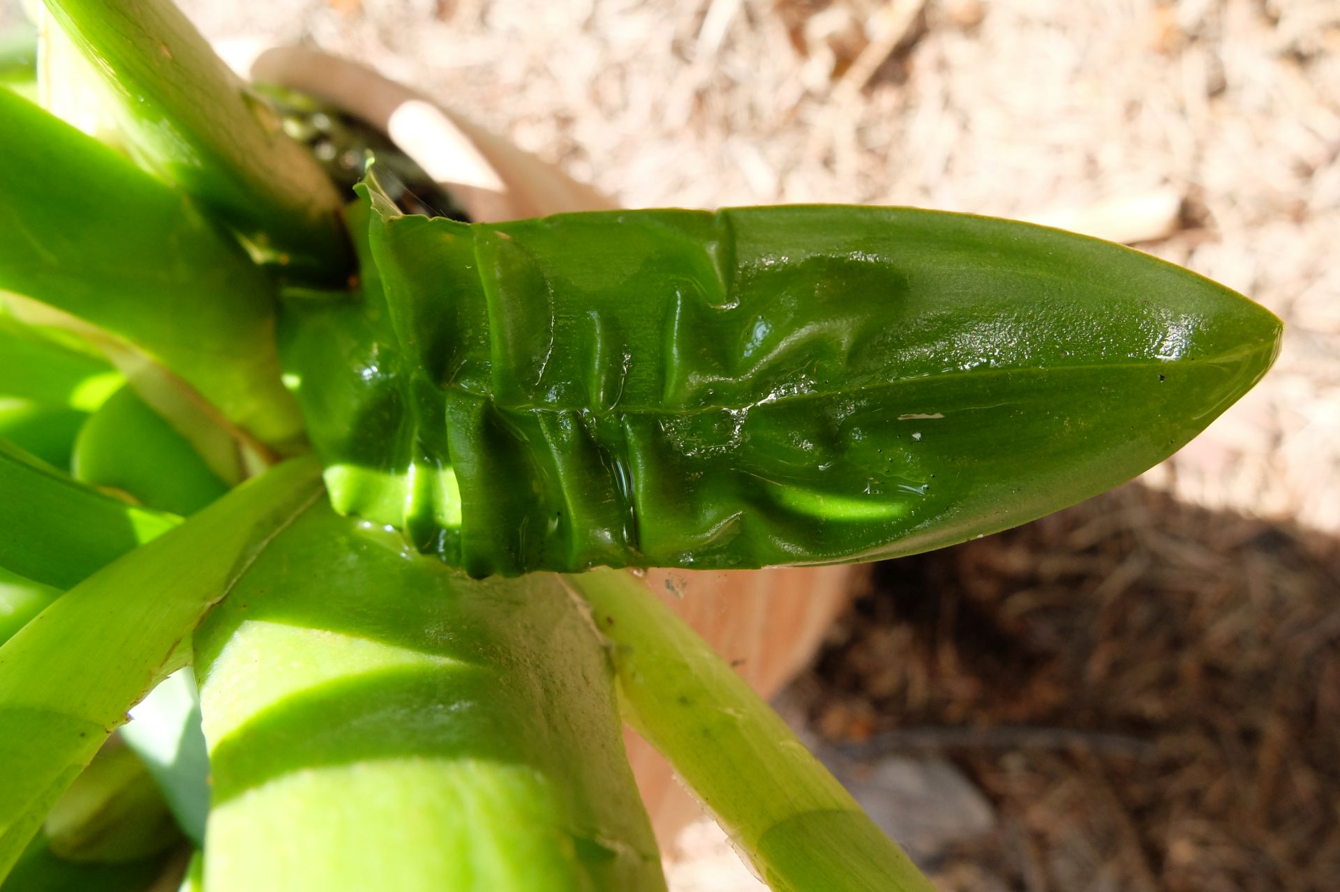 Ta sama miltonia gdy ją zabiedzoną nabyłem w LM, miała harmonijkowo pomarszczone niektóre liście ale zmarszczki były równolegle do osi liścia. A teraz jakieś dziwadła w poprzek się porobiły.