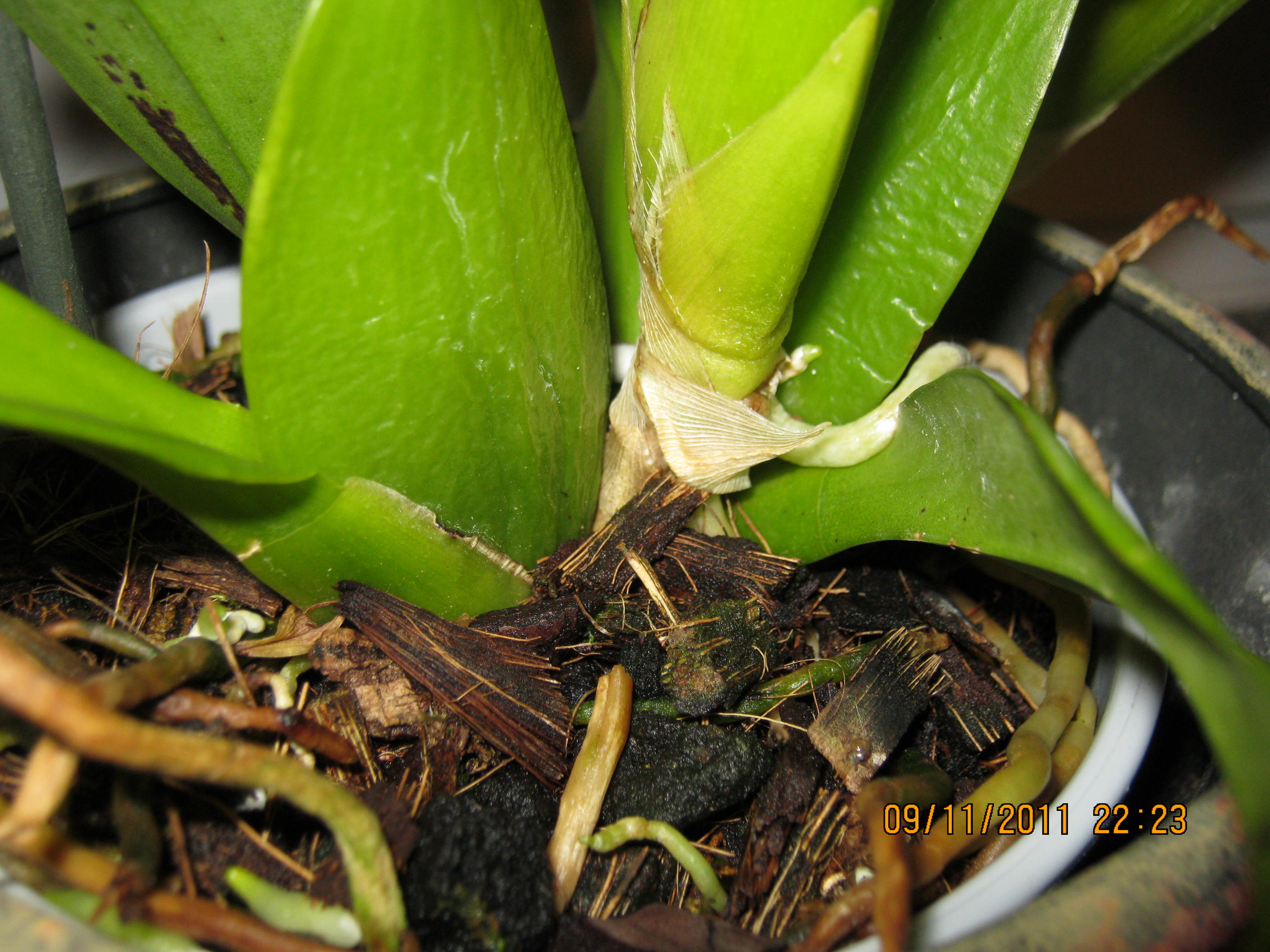 Pleśń rozwija się na podłożu ciągle mokrym. Należy doniczkę wyjąć z osłonki , a nawet wyjąć roślinę z doniczki i przesuszyć trochę podłoże. Potem podlewać , stosując okresy lekkiego przesuszenia podłoża.