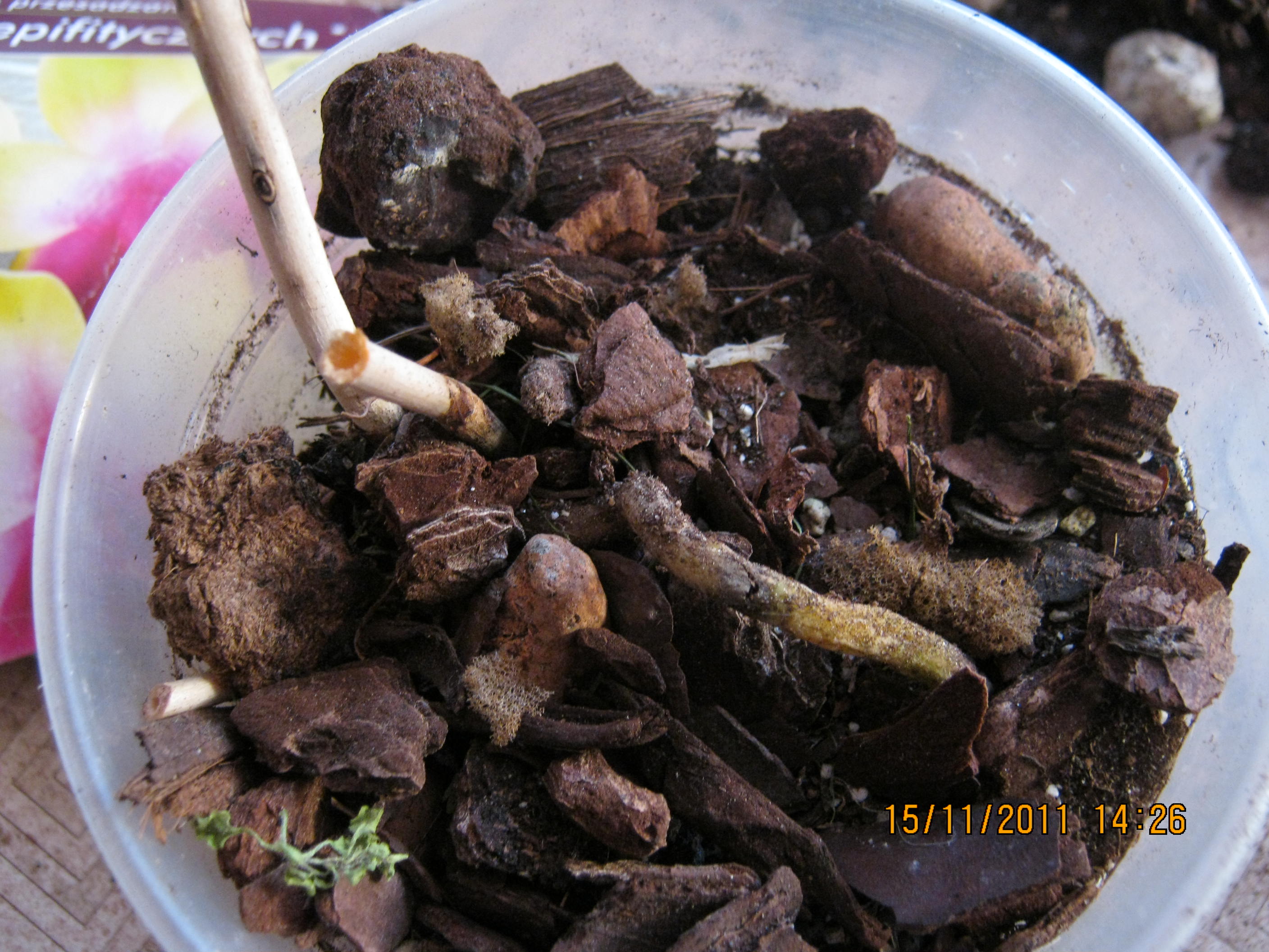 A teraz sprawa nr 2. Jeden ze nich przekwitł, więc postanowiłam mu już zmienić podłoże. Ponieważ rzuciła mi się pleść- (wywołana moim zbyt częstym podlewaniem).