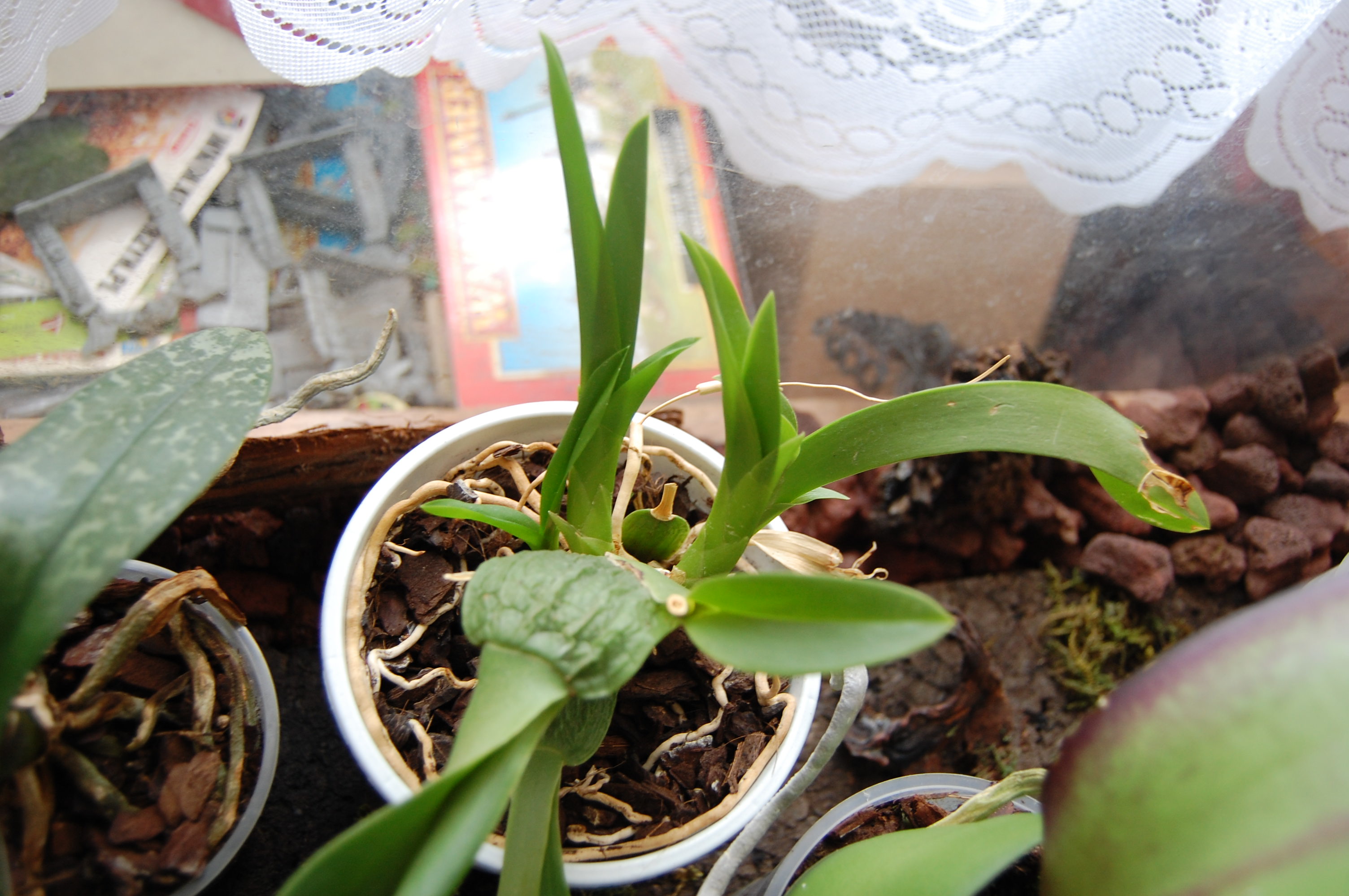 Tak, tak stoją w akwarium. To są stare fotki więc zdążyły się rozrosnąć i zamiast korka na spodzie są kamienie z lawy wulkanicznej. Ta niby Cambria (niestety nie znam gatunku bo kupiłem go gdy storczyki były tylko ozdobą dla mnie) ma już więcej młodych przyrostów ale wciąż nie kwitnie :( . Czy opłaca się przycinać korzenie i przebierać podłoże teraz czy lepiej zaczekać do wiosny?
