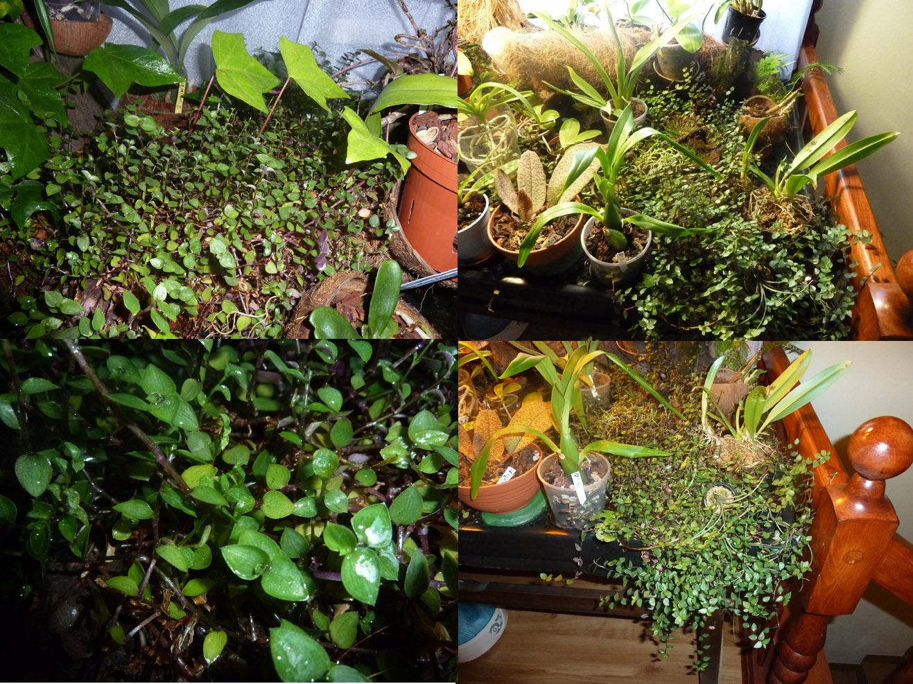 Poruszony został temat wpływu towarzystwa innych roślin na uprawę storczyków. [z racji niezbyt sympatycznie rozwijającej dyskusji wątek został usunięty] Jenak sam problem jest bardzo ciekawy i moim zdaniem wart zwrócenia uwagi. W moim parapetowym ogródku poza storczykami rośnie bluszcz i zadarniająca Soleirolia soleirolii. Niska zieloniutka roślina,która poprzez kłącza łatwo się rozrasta wpływając bardzo korzystnie na podniesienie wilgotności powietrza, mając tym samym pozytywny wpływ na wegetację storczyków. Wymaga tylko stale mokrych korzeni i niewielkich dawek nawozu ( podlewam tym co mi pozostaje przy nawożeniu orchidei ). Rozrasta się bardzo szybko i z niewielkiej kępki po dwóch latach mam to co na zdjęciach a ile już wyrzuciłem nie wspomnę.