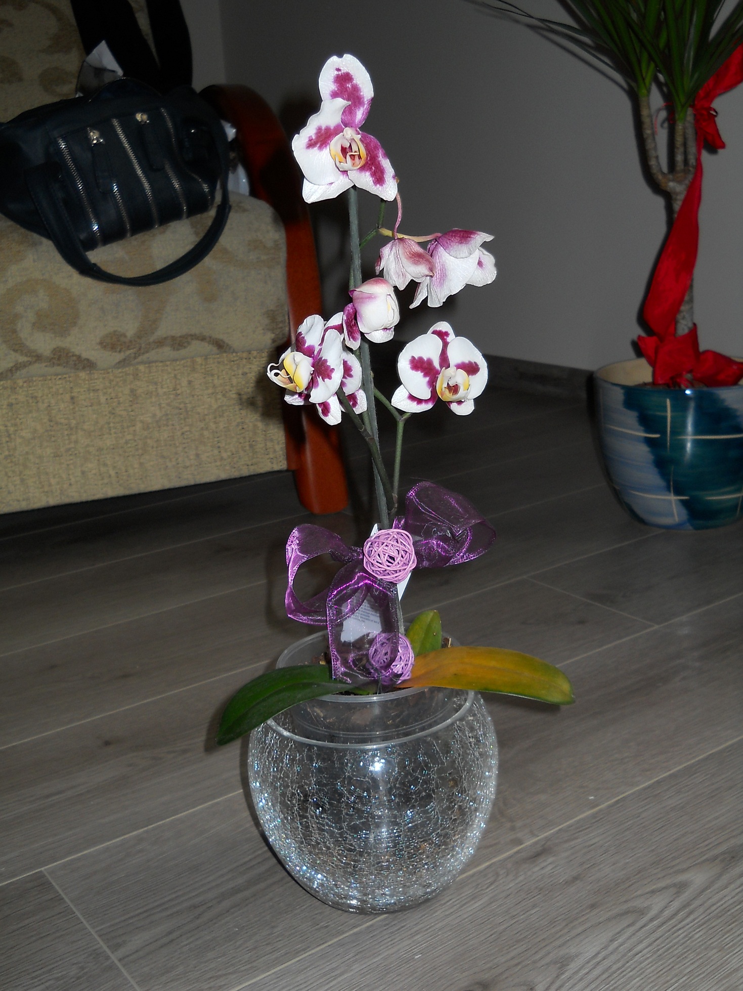 sprawia wrażenie jakby był nadłamany, ale na pewno nikt z nim nic nie zrobił... storczyki stoją u mnie na południowym parapecie, nad kaloryferem, który nie grzeje na max. Dodatkowo w doniczce wysypałam kermazyt i zalałam go niewielką ilością wody.. korzenie nie dotykają wody.. dodatkowo kwiatki zaczeły usychać