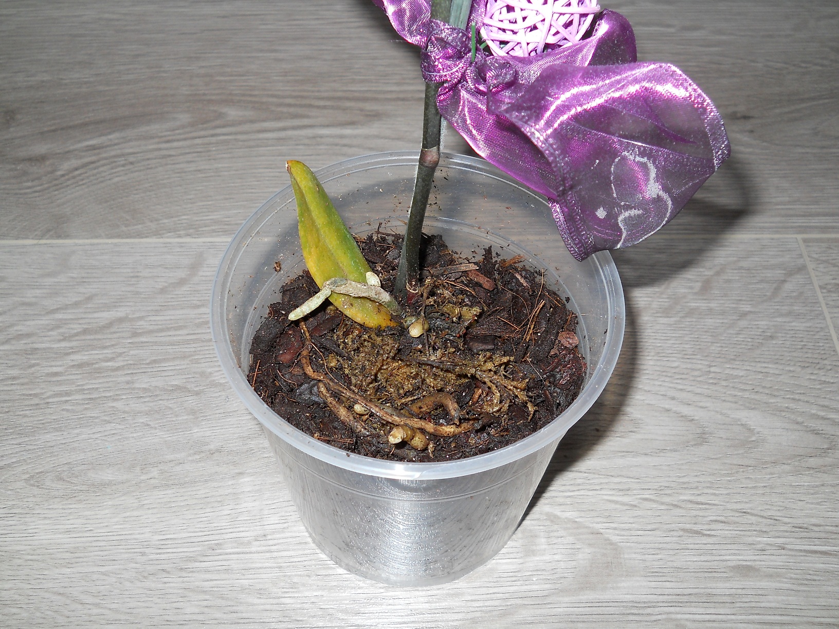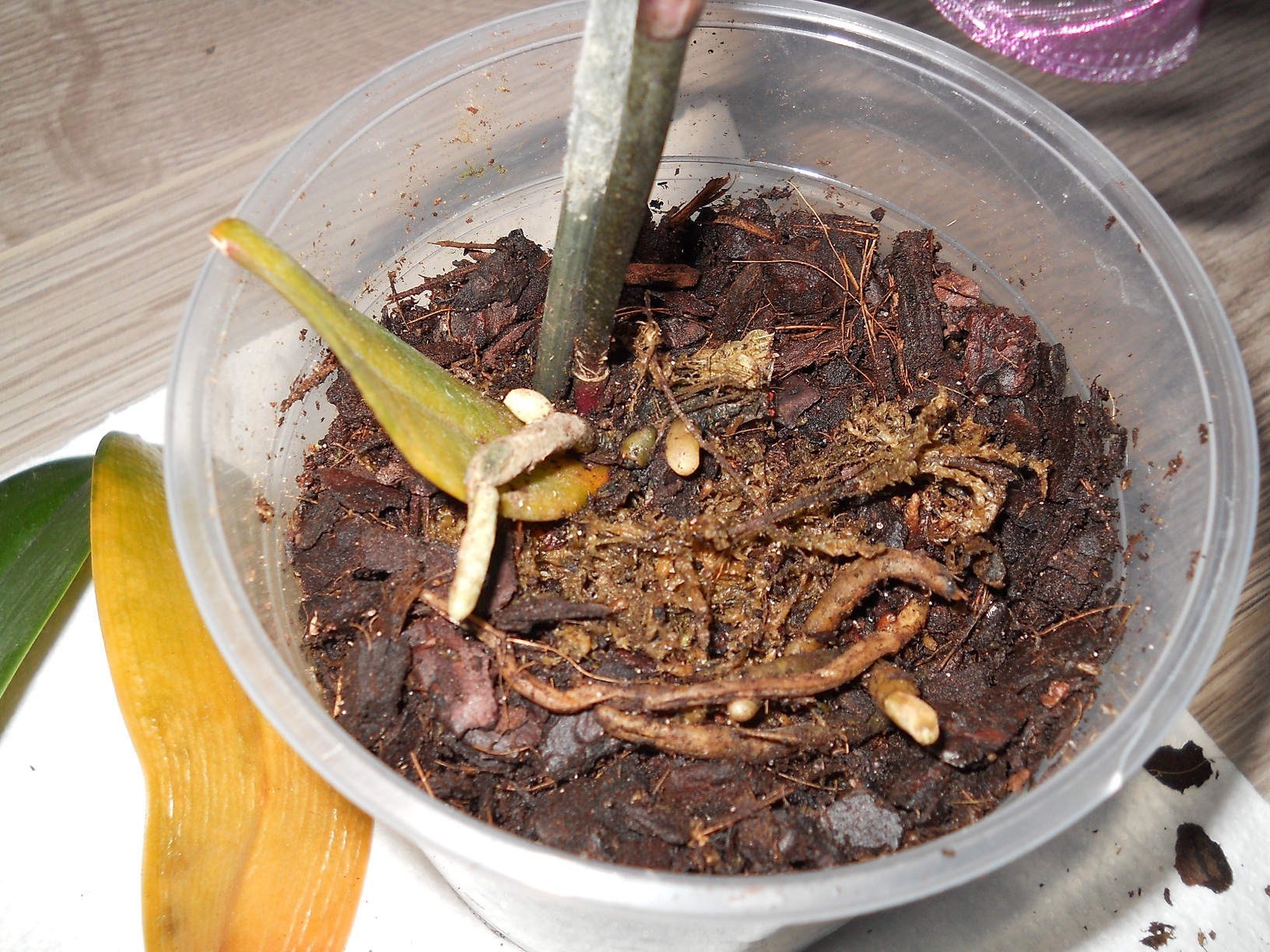 na zdjęciach widać, że z boku wyrasta jeden mały liść, niestety on również nie ma prawidłowego koloru, już robi się żółtawy...