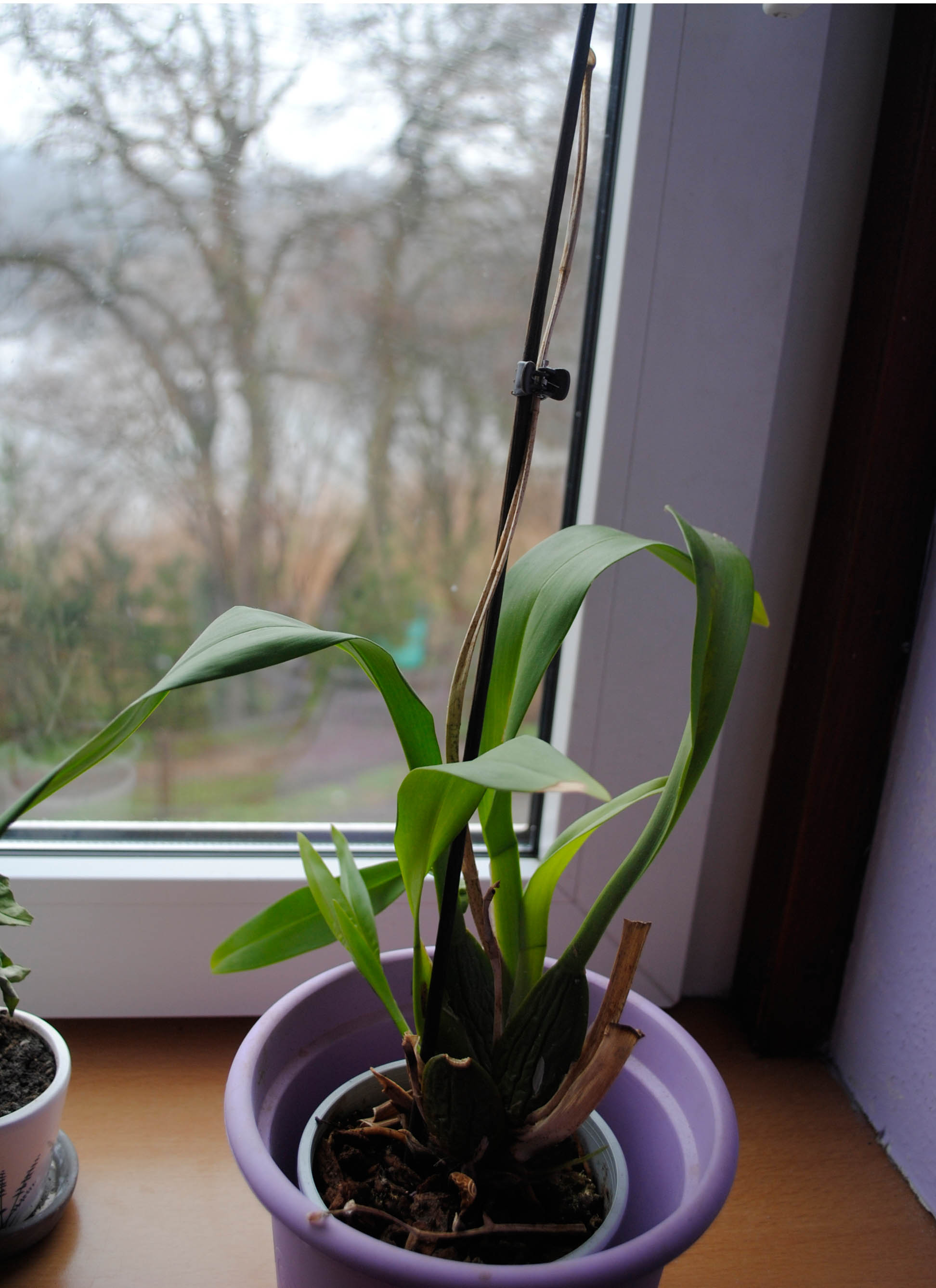 Storczyk przekwitł, ma nowe przyrosty, liście poza niewielkim przypaleniem od słońca zieleniutkie...To nie jest sztanca do produkcji kwiatków, musi odpocząć, nabrać sił przed następnym kwitnieniem. Pęd zasechł i należy go obciąć, bo nie powtórzy już na nim kwitnienia, a zaschnięte i zmarszczone stare psb nie są również niczym strasznym, tak bywa, z czasem gubią liście i marszczą się.
