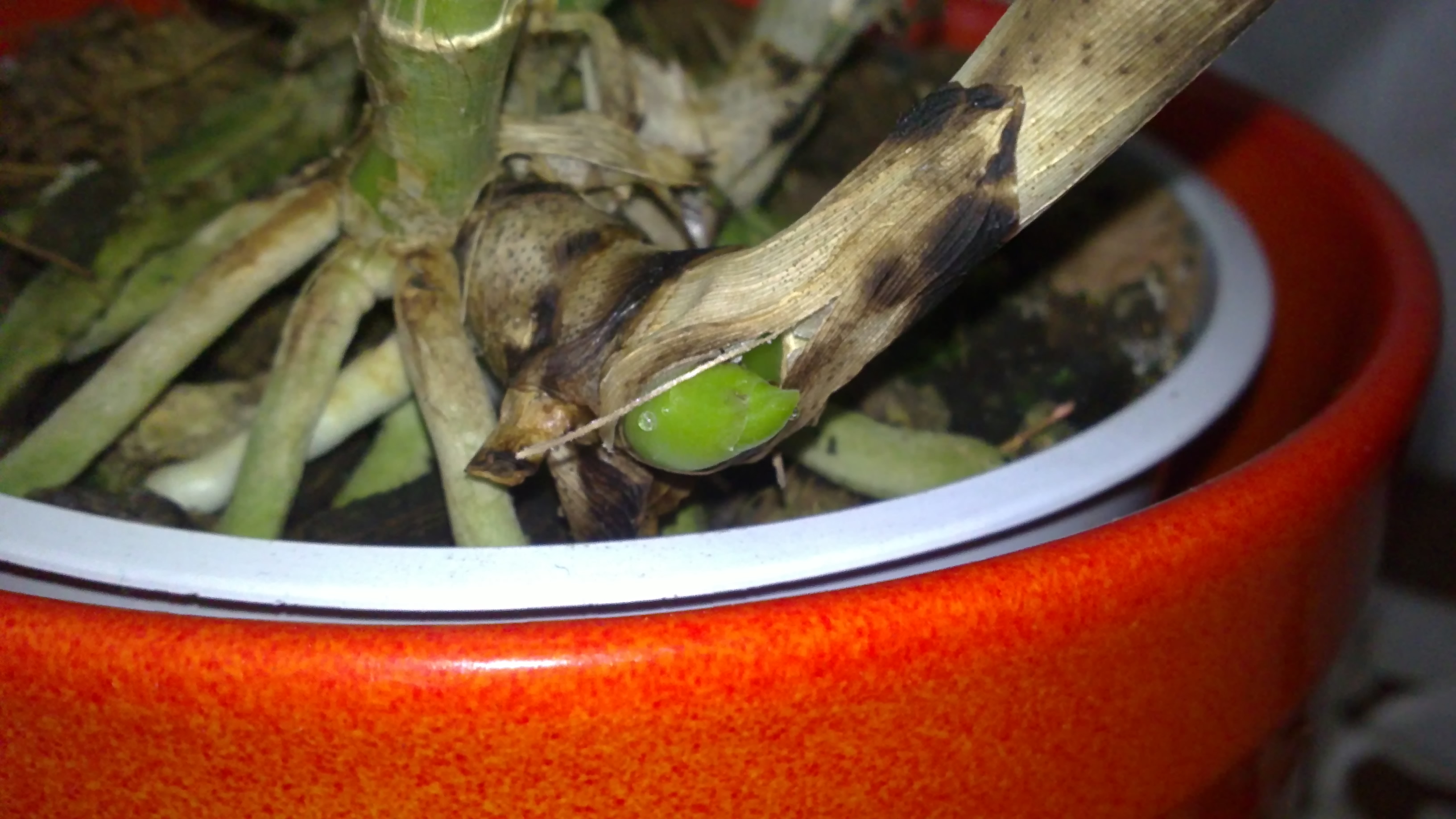 Tę kupiłam z Ekwadoru,a gdy ją ujrzałam, zbladłam.Była bez korzeni.Udało mi się ją uratować,w pierwszym sezonie wypuściła nawet pochewki,ale nie kwitła.Pomyślałam,że skoro te przyrosty były małe,to i kwitnienia nie było.W ubiegłym roku przyrosty były większe,co rokowało nadzieję że zakwitnie.Korzenie urosły itd.Nagle patrzę,a z tych korzeni tyle co widać nad podłożem,bo wewnątrz zamieszkały sobie bez mojej zgody 4 dżdżownice i zeżarły dolną część tych korzeni.Jednak z jej korzeniami są inne kłopoty.Od czasu do czasu końce jakby zanikają,czy jakby coś je spalało,albo też zjadało.Na początku myślałam,że to nawóz mineralny.Okrywałam przy nawożeniu dolistnym itd,doszłam do wniosku,że to nie to.Przecież całe korzenie mogły brązowieć.A może ona tak ma?