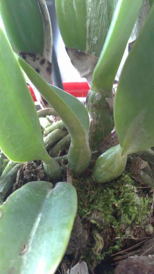 W swojej kolekcji posiadam dwie "dwuliścienne" hybrydy. Od chwili zakupu tj. kwietnia ub. roku stały na północnym parapecie, w międzyczasie wypuściły przyrosty. W sierpniu, razem z Dendrobiami wylądowały na cieniowanym południowym balkonie, zostały tam do pierwszych poważnych jesiennych chłodów. Po powrocie postawiłem je na południowym parapecie. Obydwie wypuściły pochewki kwiatowe. U "Czerwonej" (zdjęcia w moim wątku w Prezentujemy kwitnienia) pochewki zaczęły się wypełniać i pod koniec stycznia zakwitła. Pochewki u "Cukierkowej" katlei zostały puste, wypuściła dwa nowe przyrosty, które momentalnie urosły i jeden z nich pod koniec marca zakwitł trzema kwiatami. Rośliny miały takie same warunki a różnie zareagowały. W okresie wzrostu podlewałem (przez namaczanie) raz na tydzień, z nawozem co drugi raz w połowie dawki, zimą aż doniczka była lekka, czasami było to raz na 10 dni - co trzecie, czwarte podlewanie z nawozem w połowie dawki.