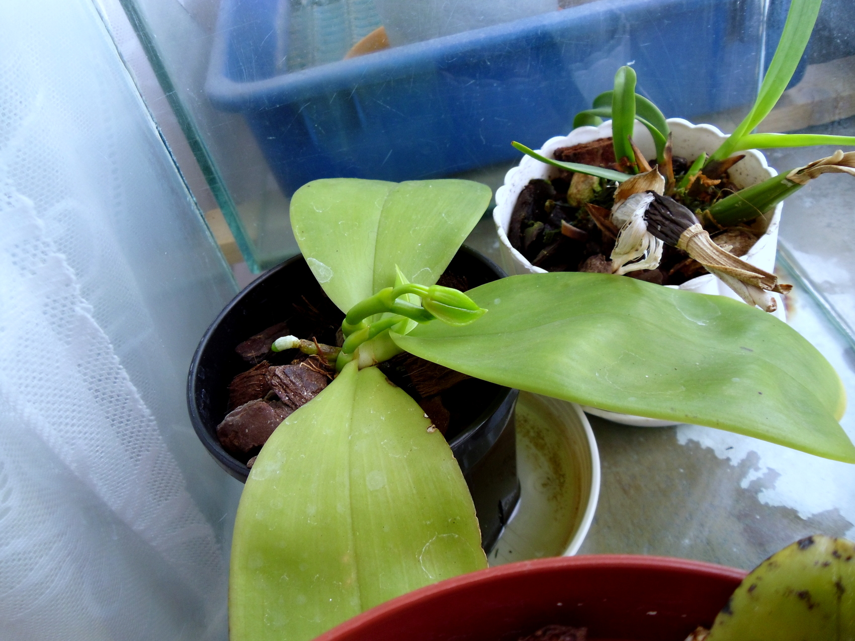 Po 2 tygodniach widoczne wyraźne przyspieszenie wzrostu starych korzeni, pojawiło się również kilka nowych, a po miesiącu 2 pędy kwiatowe uparcie prące w górę, choć wiem, że Phal. bellina z tym miewa kłopot ;)