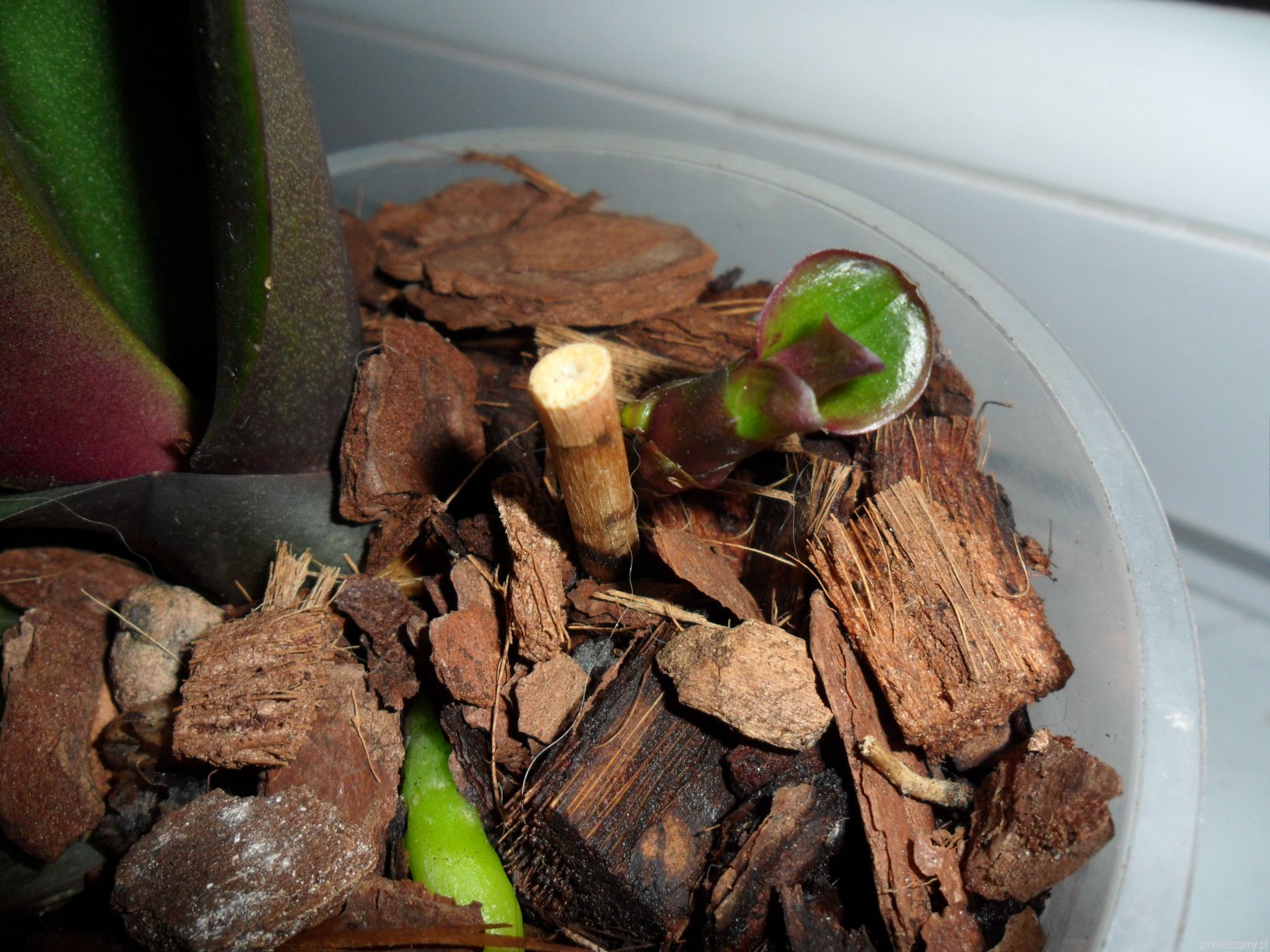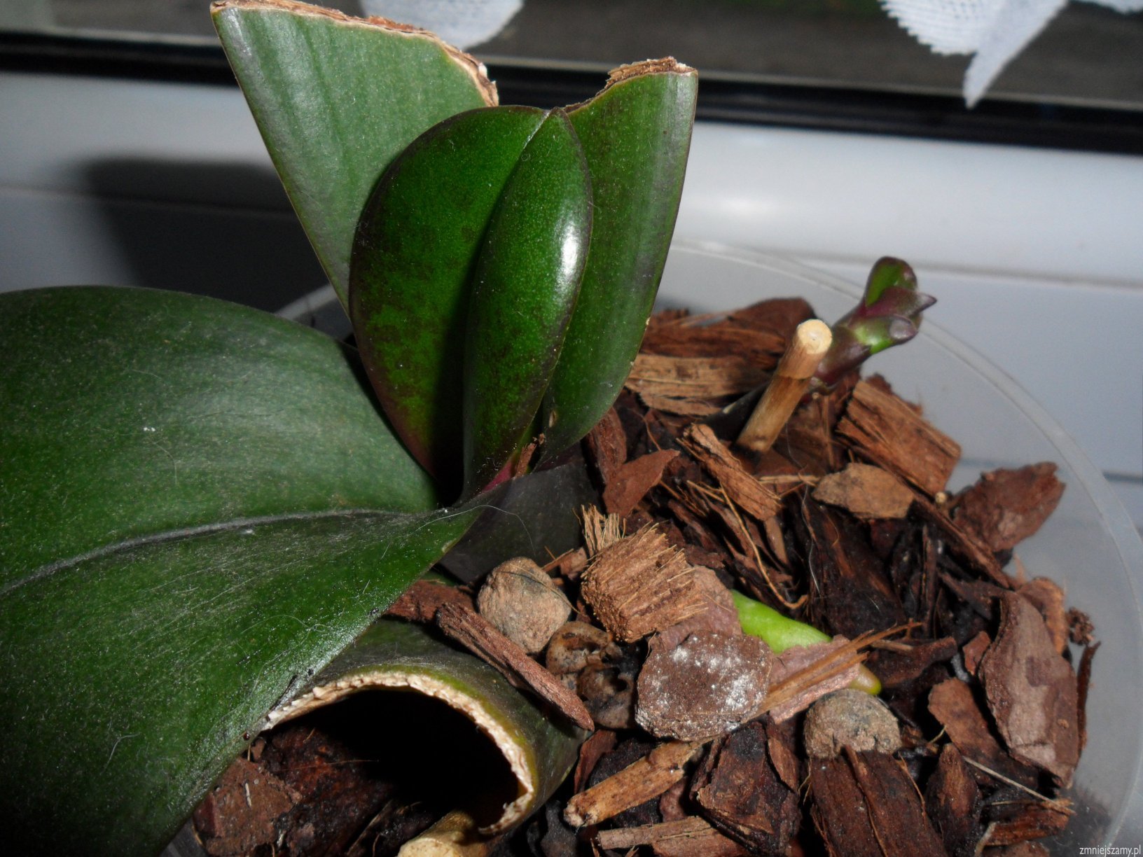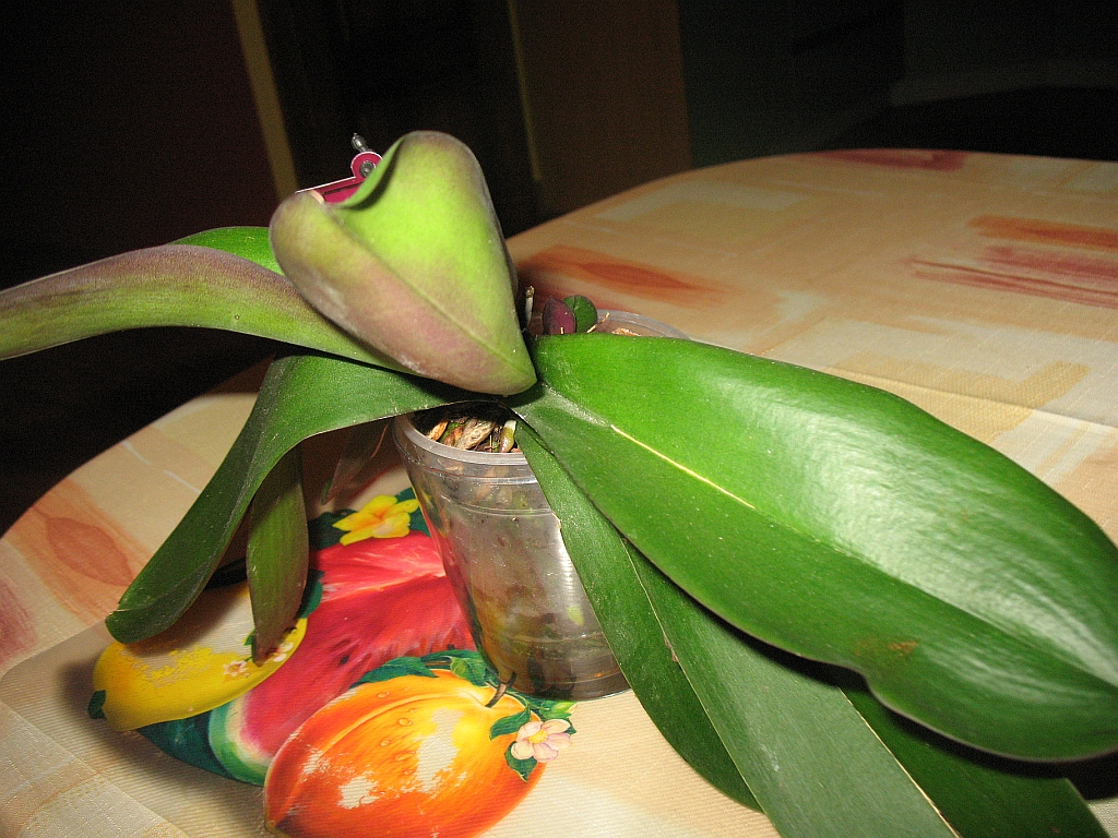 Obcięte chore liście były w styczniu i pęd kwiatowy także .Pozostał jeden liść.Teraz mamy nowe korzonki , listek i takie coś.