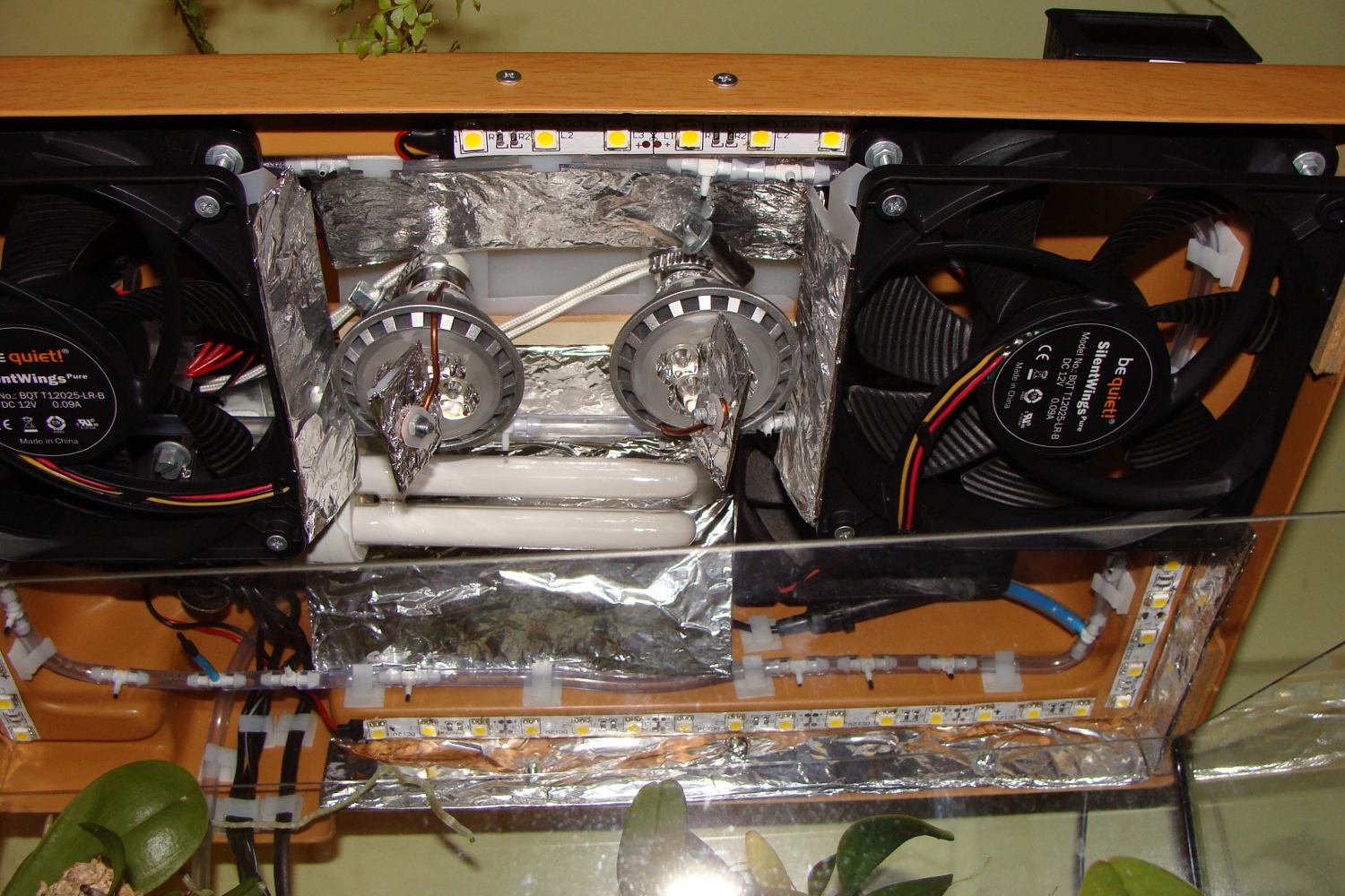 -doświetlanie (udało się uzyskać 5 - 15 tysięcy luksów w każdym miejscu, zapewniają to świetlówka, ledy w oprawach i na listwach. Ledy na listwach są wymienione na takie o dużej wydajności)