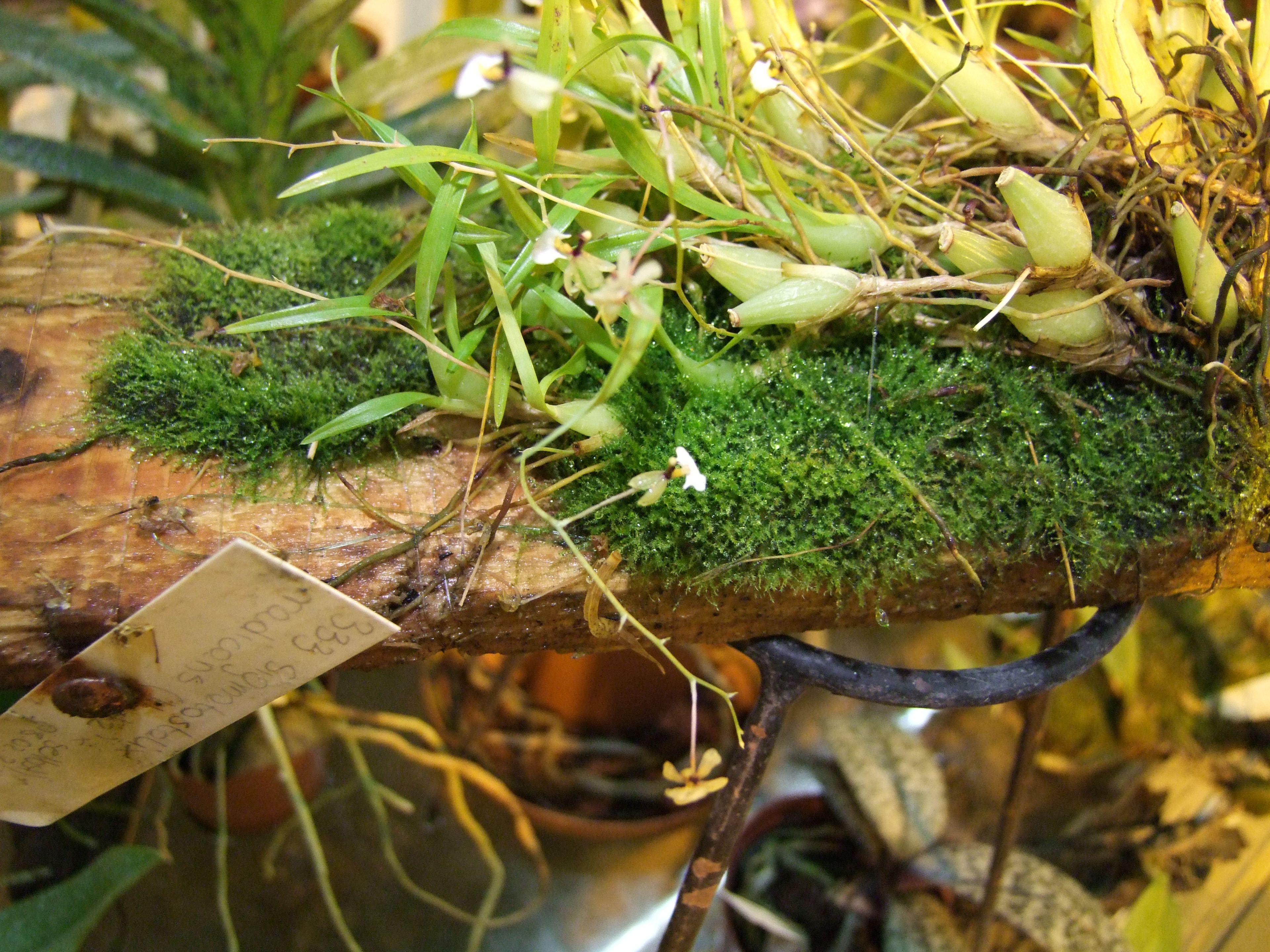 Bulbophyllum dentiferum. Podobnie zamocowane gdzieś półtora miesiąca temu. Za rok deski z pod mchu nie będzie widać.