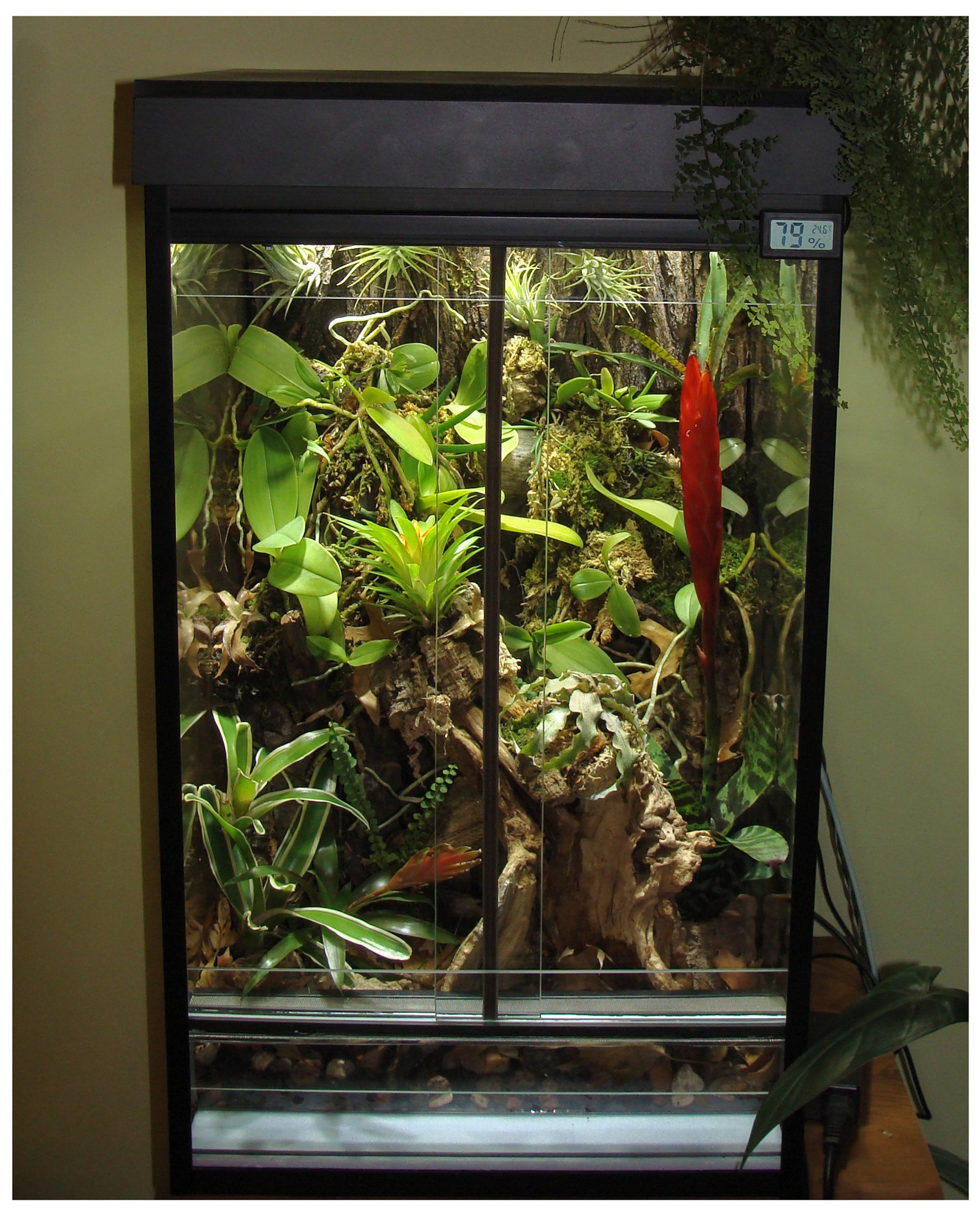Wentylacja jest "terraryjna". Ten zbiornik generalnie był konsultowany z pewnym sympatycznym Krakowskim terrarystą. Otóż są 2 kratki. Jedna na dole z przodu, druga na górze z tyłu. Gdy powstaje gradient temperatury, powietrze zaczyna przepływać ze względu na różnice w gęstości - typowa wentylacja grawitacyjna. Mój wkład polega na tym, że dodałem wentylatory pracujące na niskich obrotach zgodnie z kierunkiem grawitacyjnego działania wentylacji. Dzięki temu nawet w nocy, gdy nie ma gradientu temperatury, wymuszam ciągłą cyrkulację powietrza i działa to przednio (dymiłem sobie trochę świeczką - tylko 2 wentylatory a ruch powietrza w całym zbiorniku - robicie orchidarium - bazujcie na terrarium