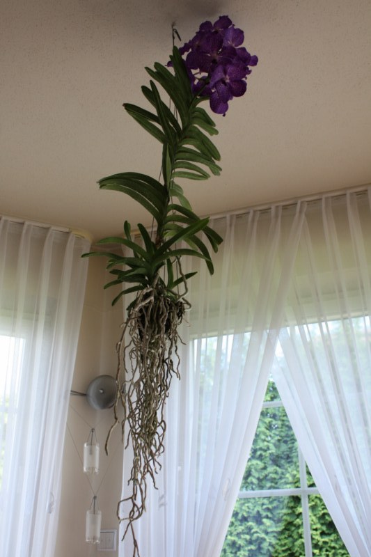 Mam takie pytanie. Całkiem niedawno po przyjściu do chłopaka zobaczyłam storczyka (nie wiem jaki to rodzaj, za mało się znam) który wisi pod sufitem. Jak widać na zdjęciu jest podwieszony a jego korzenie swobodnie zwisają. "Podlewanie" odbywa się metodą spryskiwania woda destylowaną. Co Wy na to - czy takie utrzymywanie storczyka jest dla niego korzystne? Poza okresem kwitnienia storczyk przebywa w szklarni, gdzie też jest podwieszony w ten sam sposób. Wiem, że zdjęcie może nie jest idealne - obiecuję że się poprawię pod względem jakości