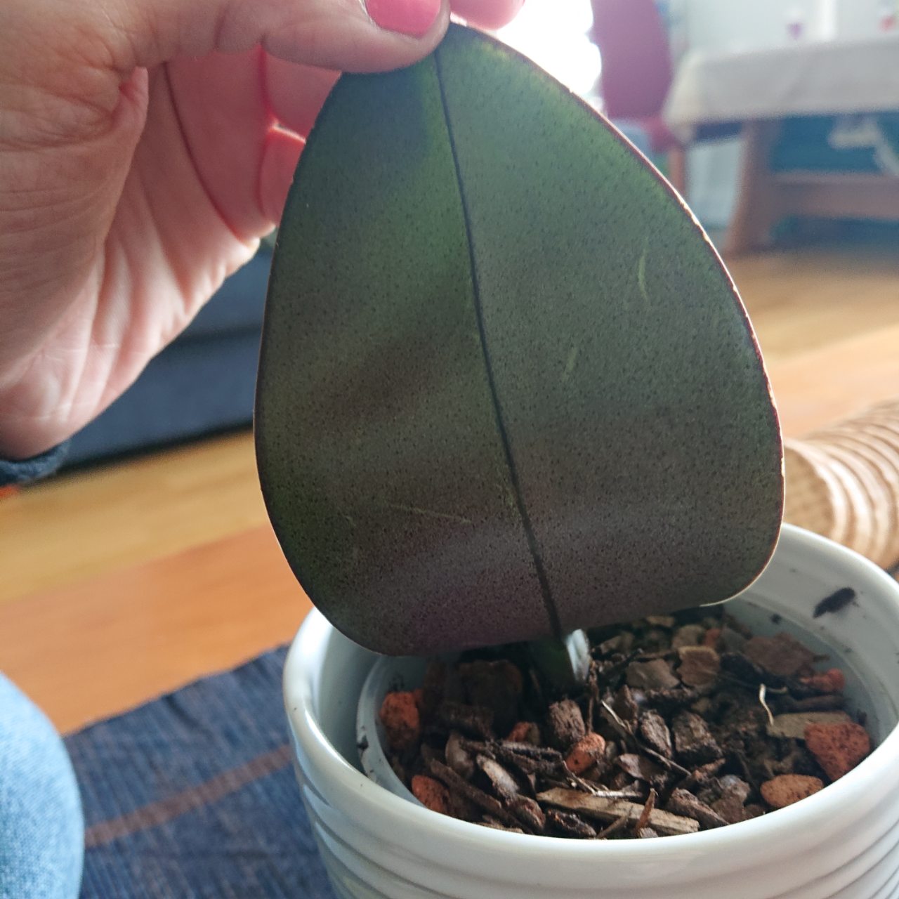 Właśnie go wsadziłam w nowe podłoże, a wcześniej do roztworu wody z wodą utlenioną, nie było żadnego robactwa na szczęście. Kropeczki na liściach to niestety plamy po lakierach i innych paskudztwach do włosów.