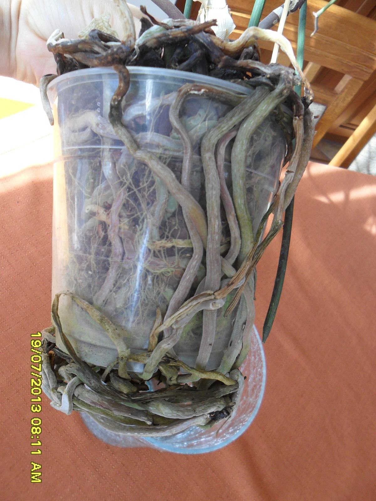 Jakiś czas temu podczas fali upałów zapukała do moich drzwi sąsiadka z prośbą o pomoc, w dłoniach dzierżyła ogromnego storczyka, w równie wielkiej osłonce, który spływał jej przez ręce, liście zupełnie wiotkie, mówi, podlany, cieniowany, żadnych zmian odżywki, wody, co mu jest? Myślę sobie korzenie zgniłki pewnie, wyjmuje doniczkę z osłonki i co się okazuje? 1/3 doniczki od dna wyraźnie ciepła. Korzenie na tej wysokości to zbita, śmierdząca masa. Wątpię, czy korzenie tej rośliny w bez wątpienia estetycznej osłonce miały szansę na oddychanie. Po prostu się zaparzyły.