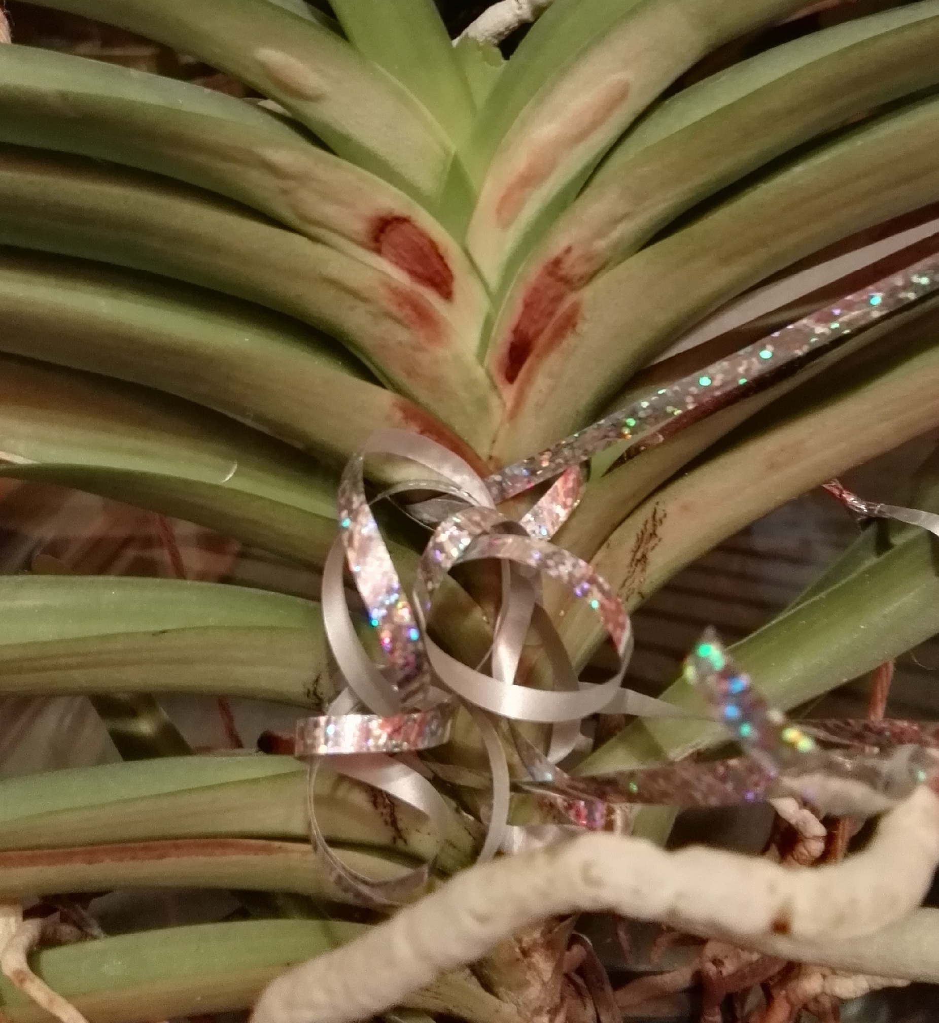 U mojej Wandy Jakieś 2-3 miesiące temu pojawiły się dziwne plamy na liściach. Myślałam że jest to spowodowane przypaleniem przez słońce bo wisi na drzwiach balkonowych a niestety latem za późno zauważyłam że ostro tam świeciło słońce. Przewiesiłam ją na drugą stronę i okazało się że plamy pojawiają się nadal pomimo tego że słońce już nie świeci na liście. Najpierw pojawiają się zgrubienia, które następnie ciemnieją. Bardzo proszę o odpowiedź czy ktoś miał kiedyś taki problem i czym może to być spowodowane?