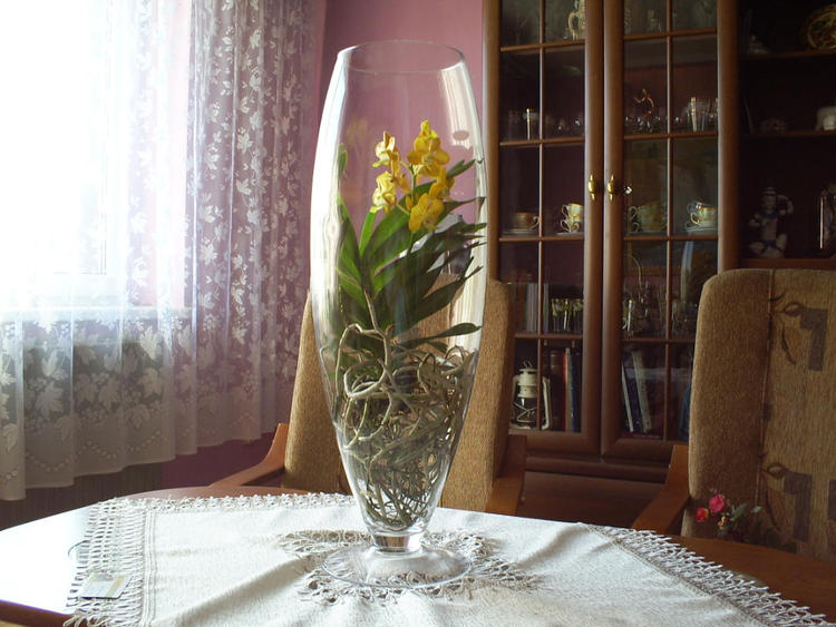 Z tego,co się orientuję,w wazonie powinny być tylko korzenie,liście ponad nim.Mogłaby też stać bliżej okna,ale wciąż za firanką,będzie lepiej rosła i kwitła.