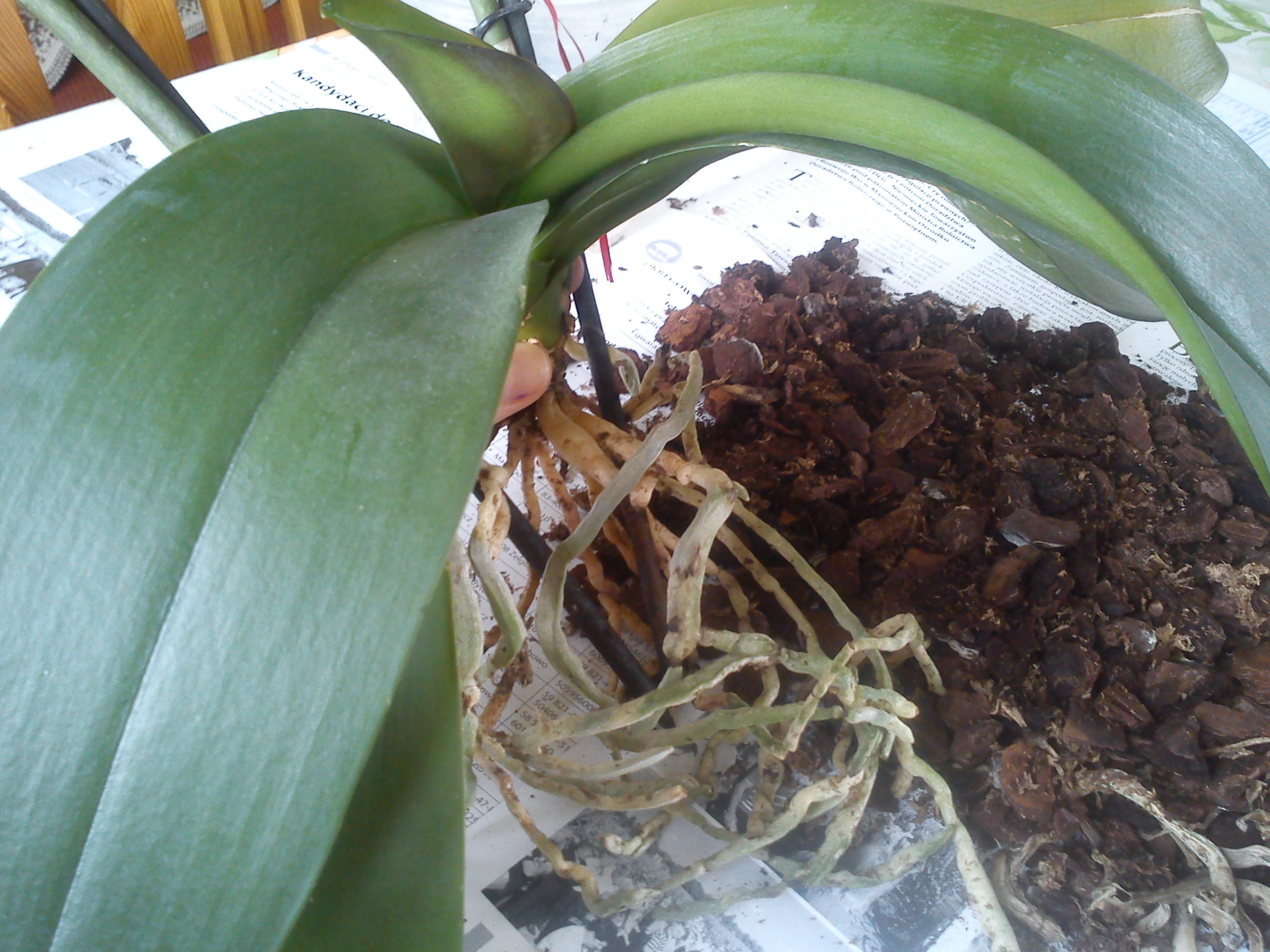 Witam, znowu tu wracam. Przesadziłam storczyka, obcięłam wszystkie brzydkie korzenie, martwe i zgniłe. Jakieś kilka dni temu zauważyłam, że zaczął wypuszczać nowe korzenie (?), czyli chyba ma się dobrze (?). Aczkolwiek widzę, że jego liście są jakby zwiędłe, lekko pomarszczone. Jaka jest tego przyczyna? Poniżej wstawiam kilka zdjęć poglądowych. Proszę o rady, sugestie.