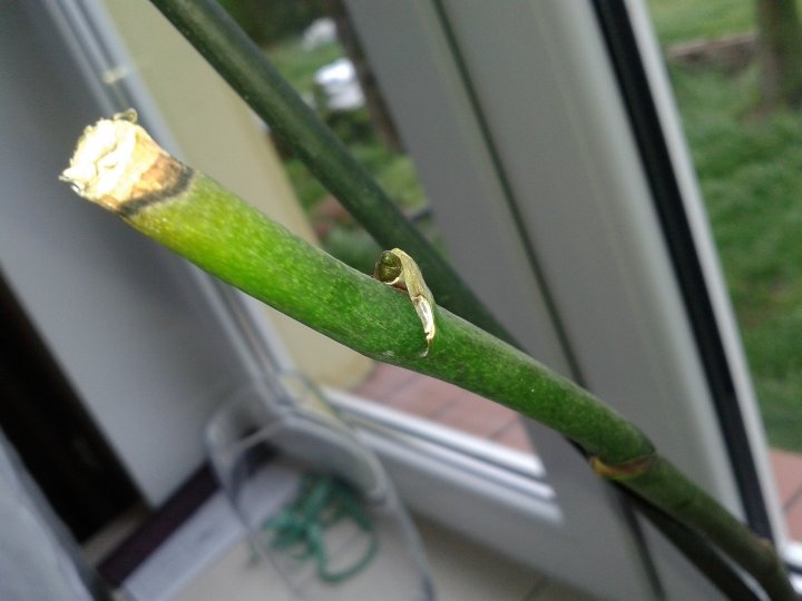 Wypuszcza sobie korzonki. Gdy urosną i będzie nimi wchłaniał wodę liście odzyskają turgor. Teraz, jeśli w ogóle zasilać to 1/4 dawki. Nawóz Plant Starter jest najlepszy w takiej sytuacji. Marta