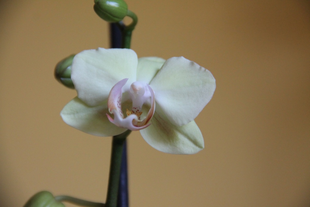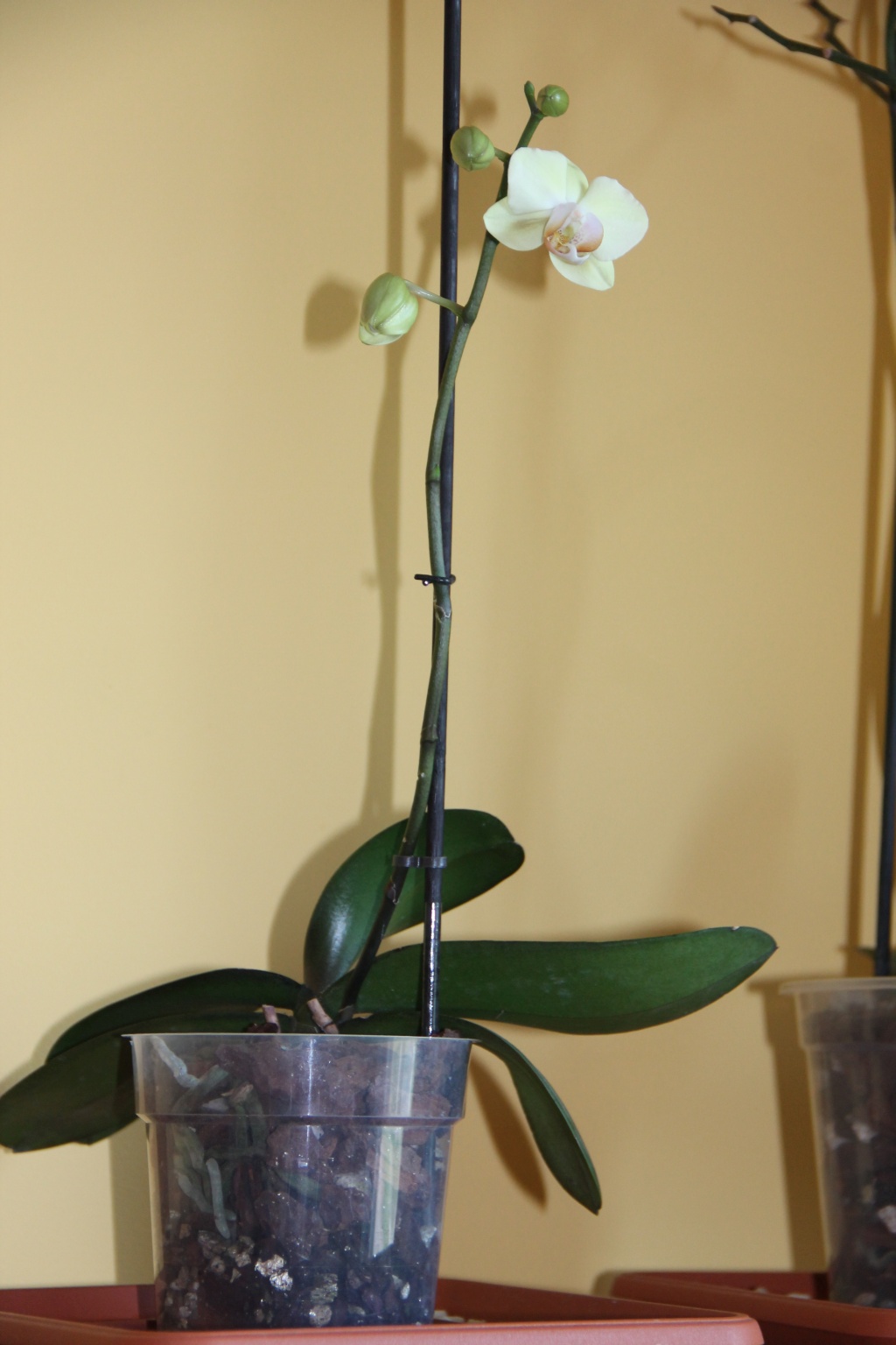 Phalaenopsis którego uratowałem przed śmiercią w śmieciach (pisałem o tym wcześniej) i wylądował u mnie po jakimś czasie wypuścił pęd kwiatowy a teraz nareszcie zakwitł małym kwiatem wielkości około 5 cm w kolorze delikatnie żółtym.Teraz nie wiem czy nie miał siły jeszcze na duże kwiaty czy pochodzi ze storczyków typu multiflora cy coś jeszcze innego.Proszę o pomoc w określeniu jakiego typu storczyka uratowałem.Dodaję zdjęcia.