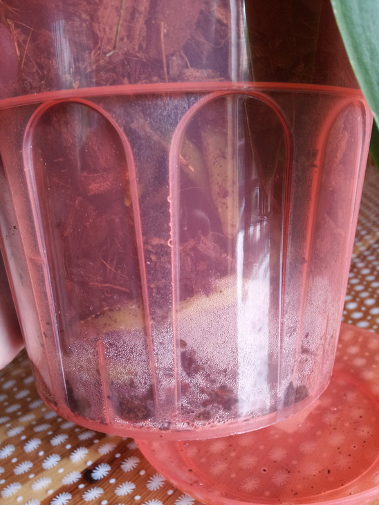 Stoi na północnym oknie, od przesadzenia nie był jeszcze podlewany ale widać jeszcze zaparowaną doniczkę od wewnątrz i na podstawce niewielką ilość wody...